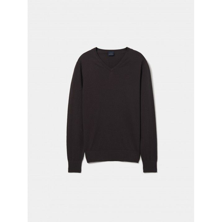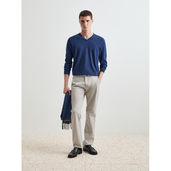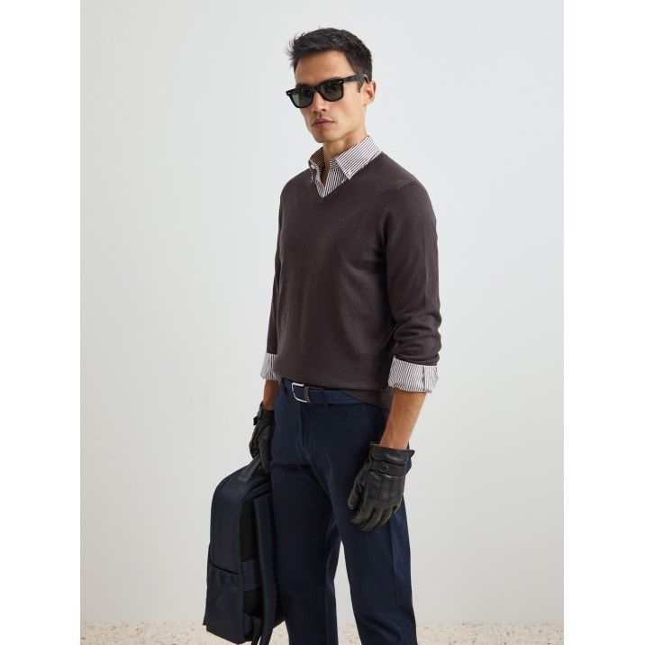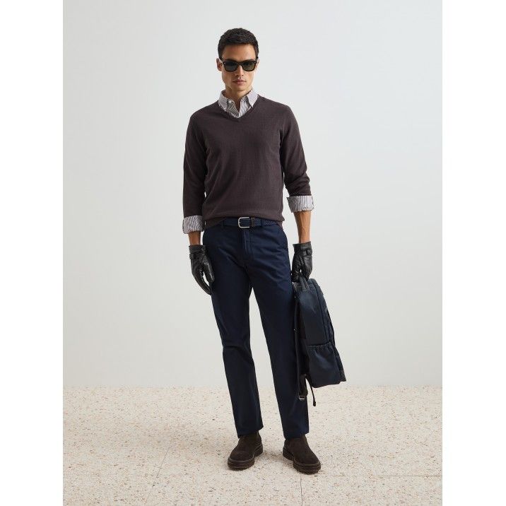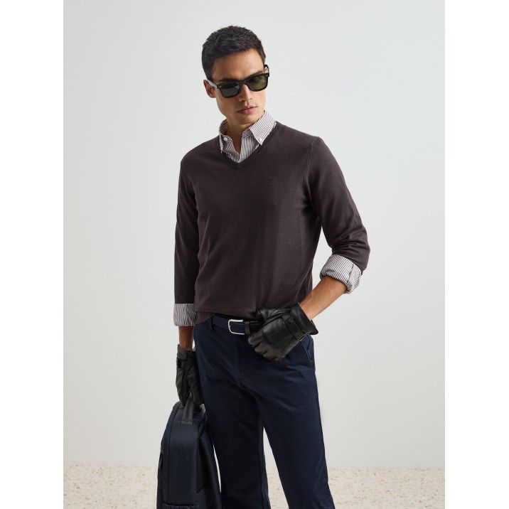 Um essencial sofisticado para os dias mais frescos. Este pullover de manga comprida com decote em V combina o conforto do algodão com a suavidade natural da caxemira. Versátil e intemporal, adapta-se facilmente a visuais casuais ou mais elegantes.
