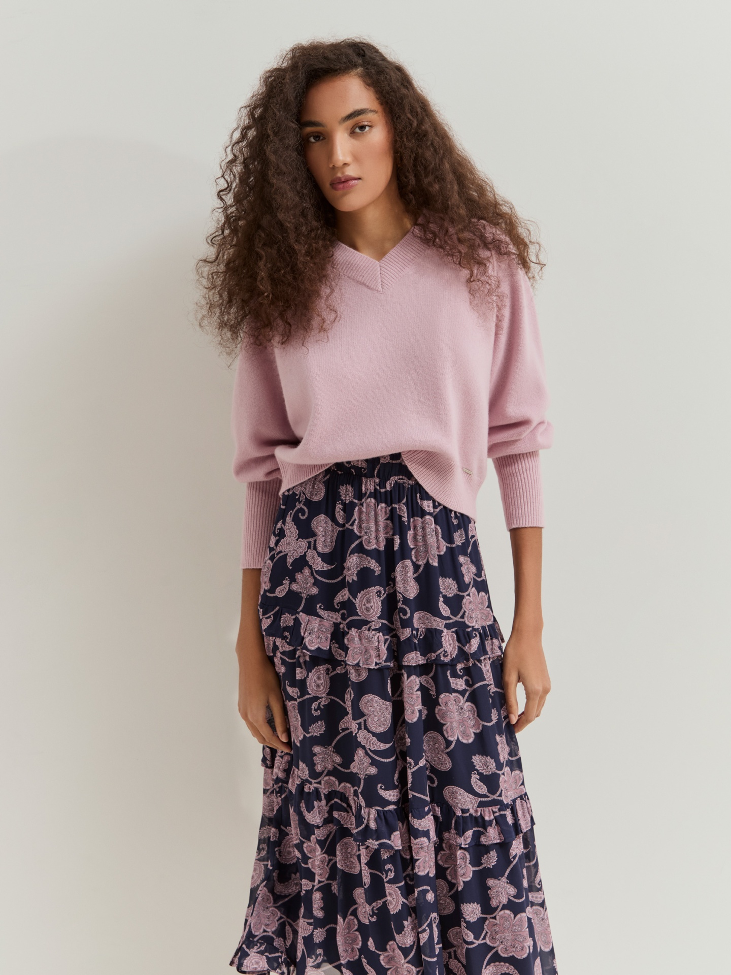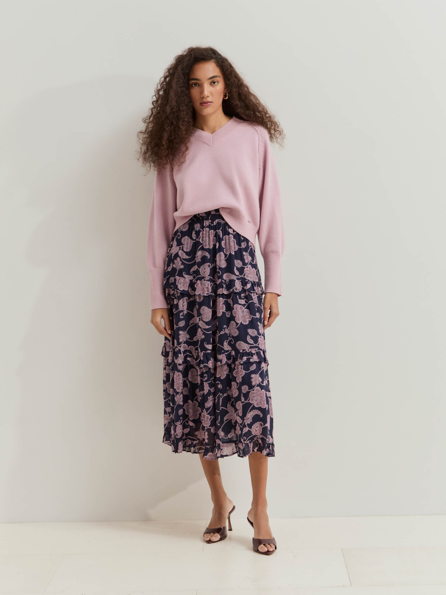 Saia comprida em azul-escuro com estampado contrastante em rosa-claro. O design em camadas com folhos confere leveza e movimento à peça, enquanto a cintura elástica garante conforto e um ajuste perfeito. Uma escolha feminina, confortável e versátil.