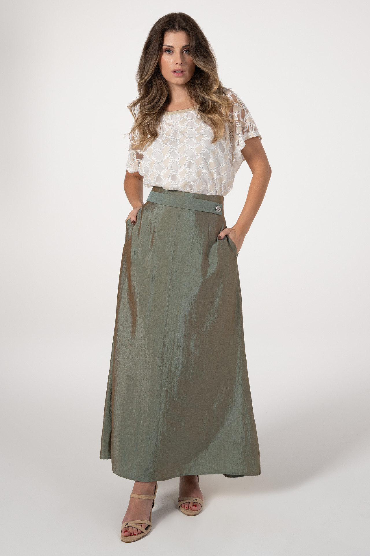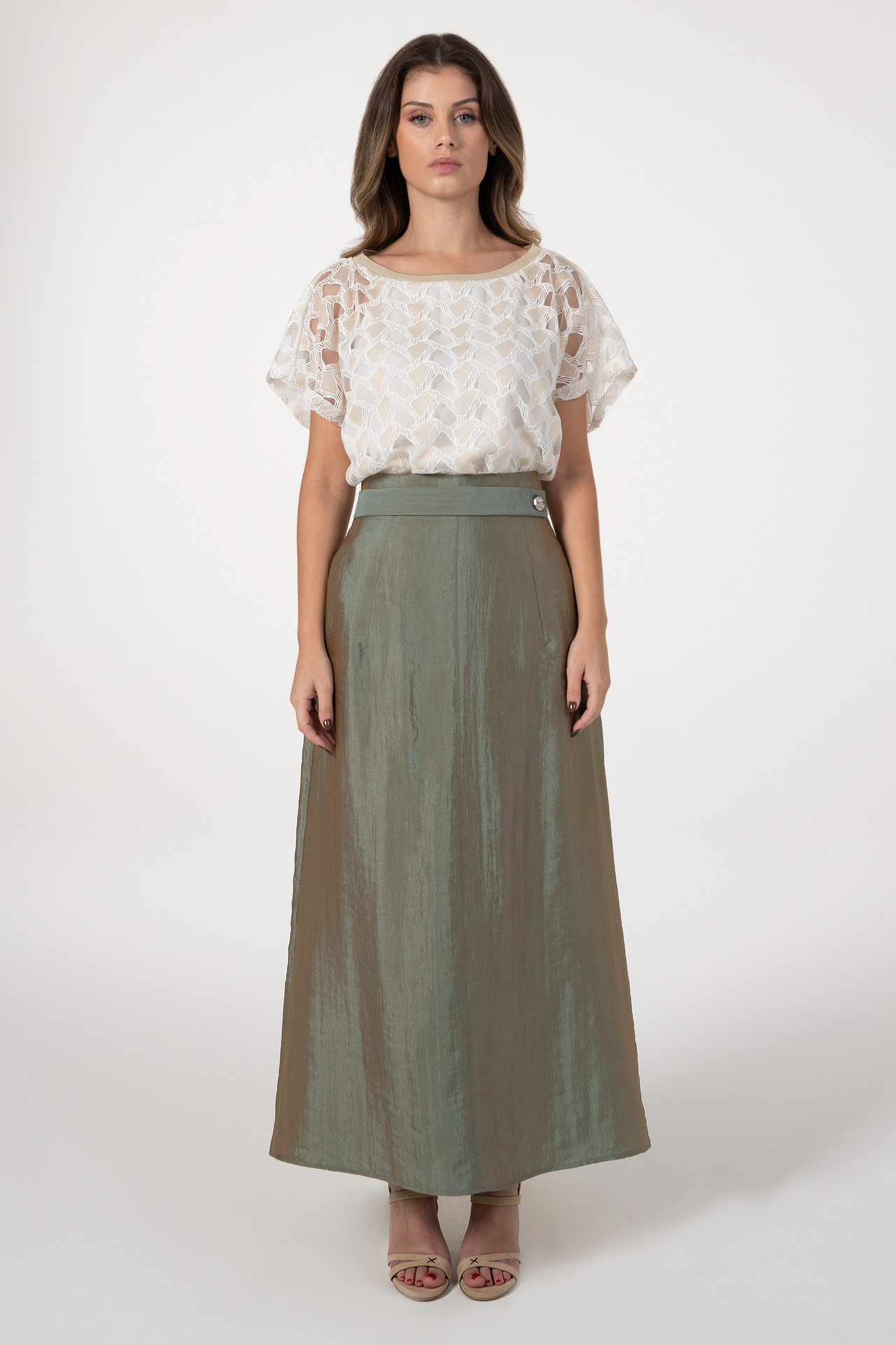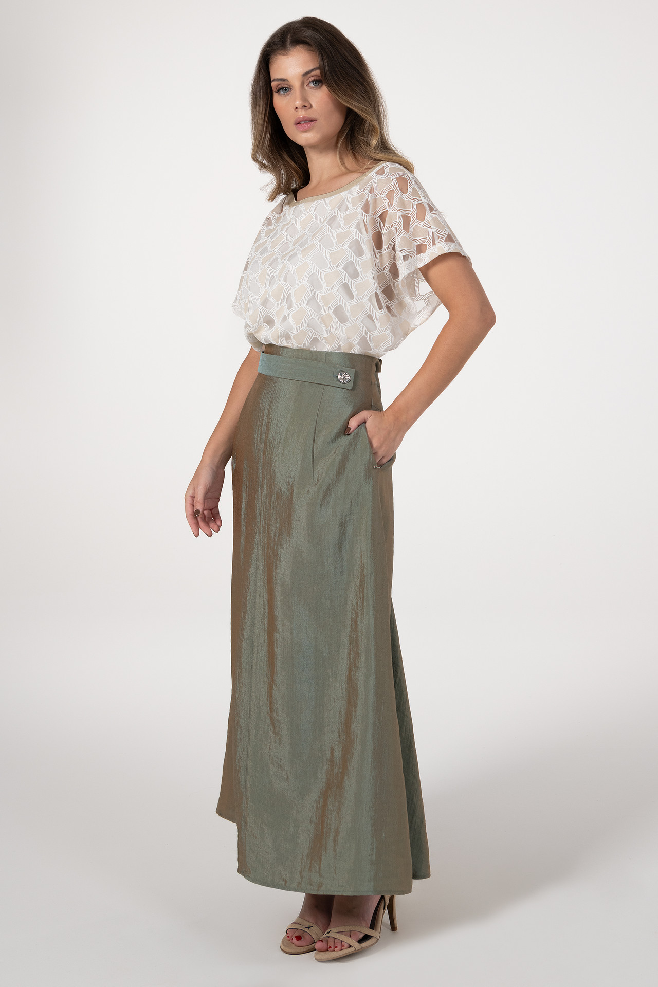 Saia com fitting em linha A, com estrutura que confere volume e um efeito mais armado à peça. Apresenta bolsos laterais embutidos e detalhe de tira na frente com botão, acrescentando um toque distintivo. A parte de trás é ligeiramente mais comprida, formando um subtil efeito de cauda. Aperta na costa com fecho, garantindo conforto e um acabamento discreto. Pode ser combinada com o top da mesma coleção para um look coordenado e elegante.