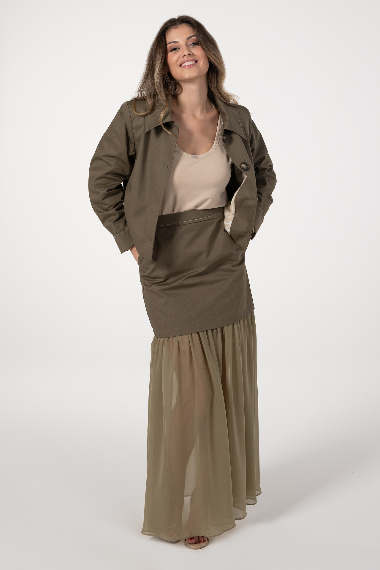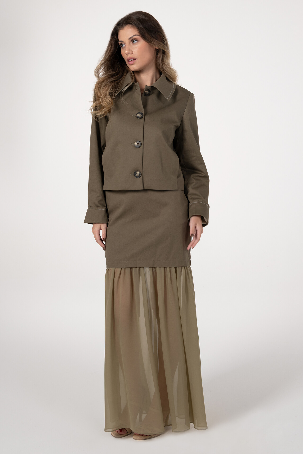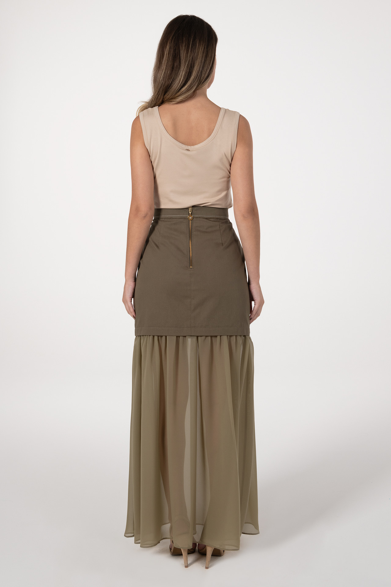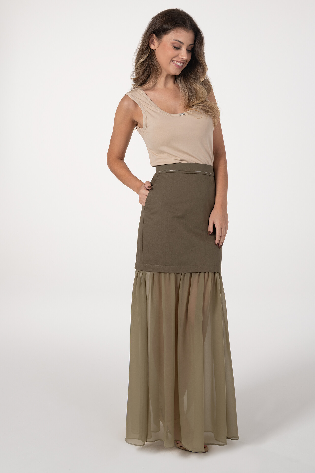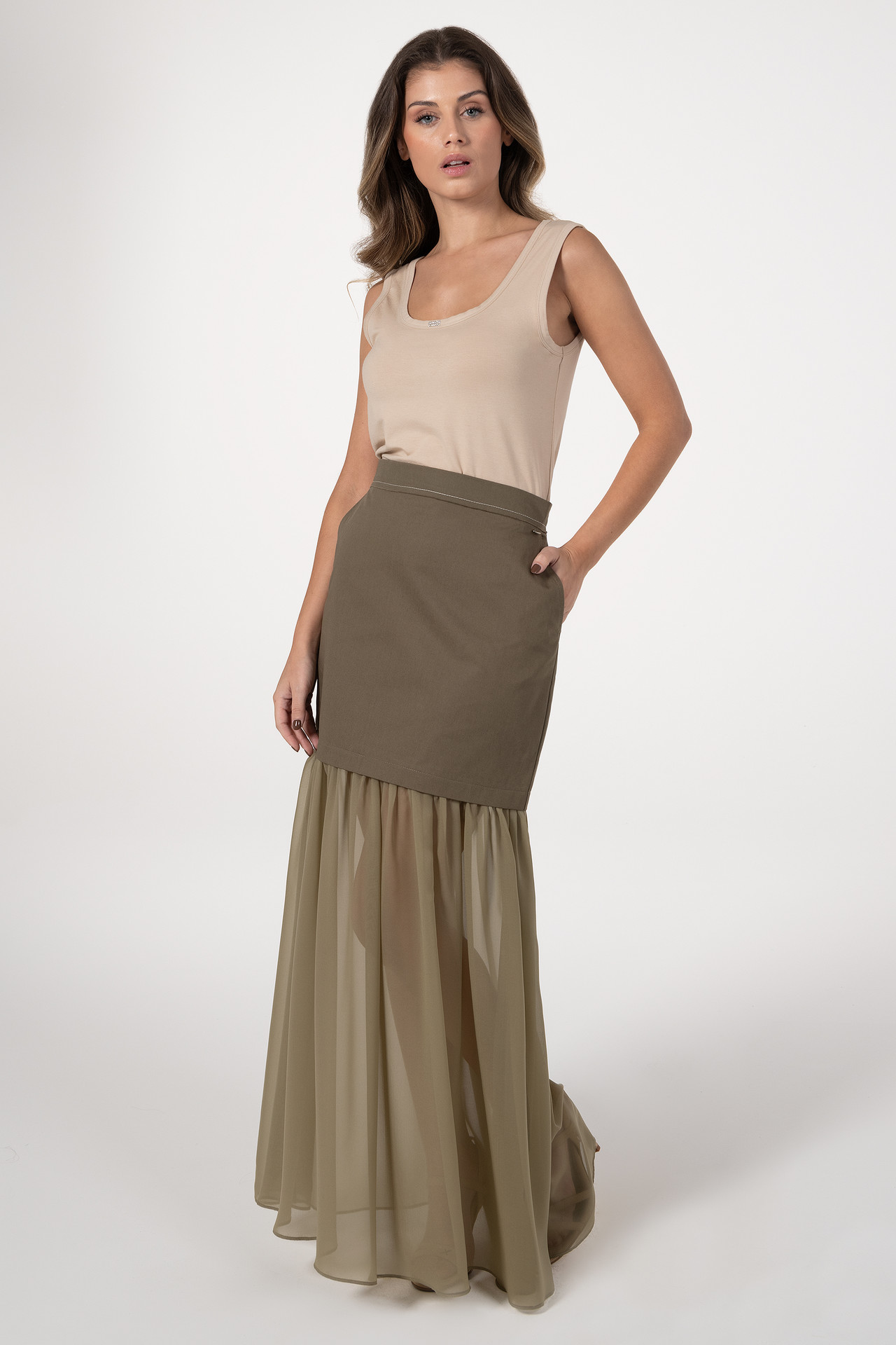 Saia midi com combinação de tecidos, destacando-se pela parte inferior franzida que acrescenta movimento e leveza. A bainha em tecido com transparência confere um toque delicado e sofisticado. Inclui bolsos embutidos para maior funcionalidade. Aperta nas costas com fecho discreto.