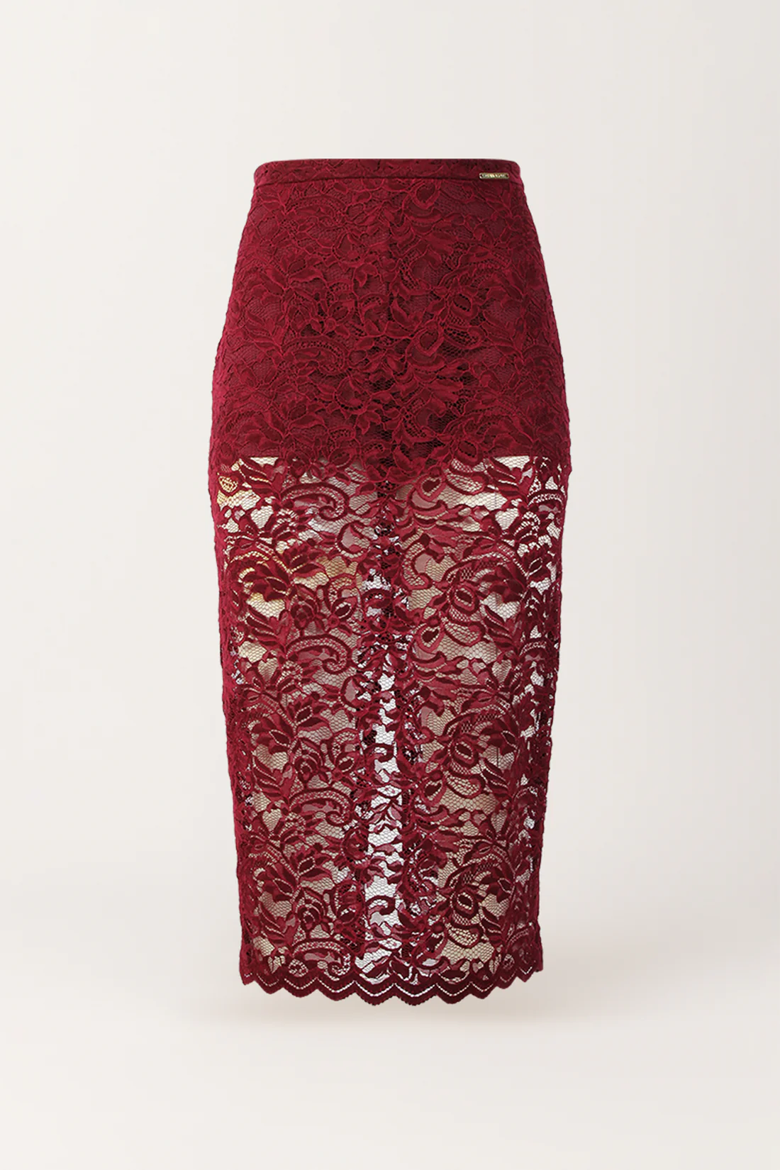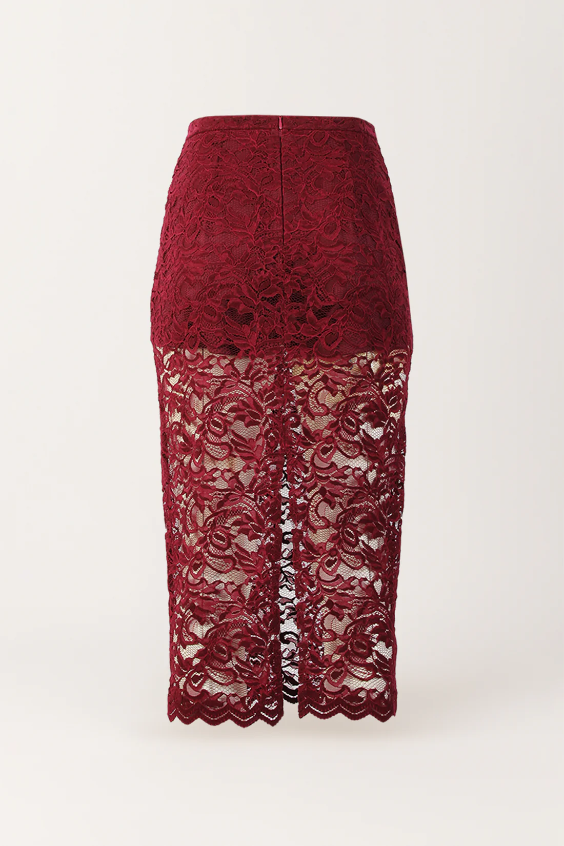 Saia midi em renda floral com forro curto. A transparência gradual destaca o padrão do tecido e o recorte ligeiramente ajustado mantém a linha do corpo. Bainha rendada com contorno irregular, pensada para movimento e contraste.