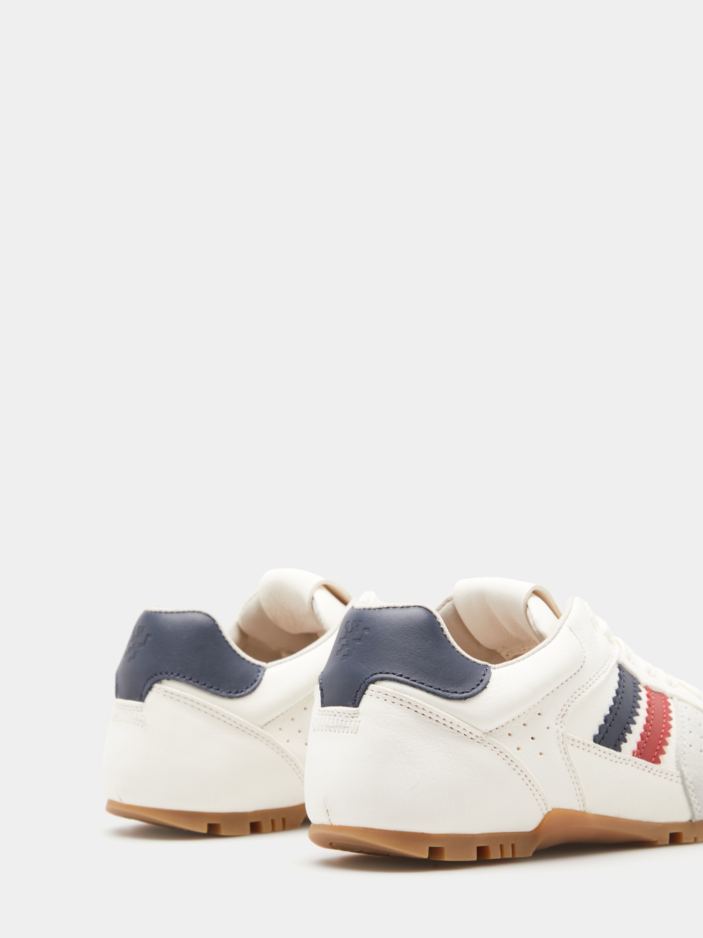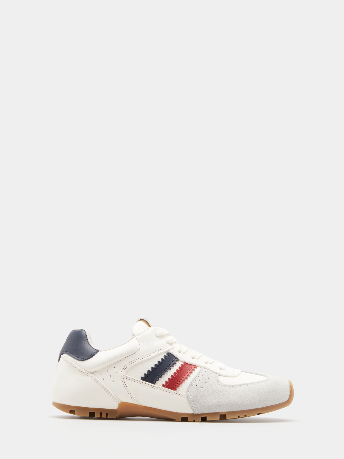 Sapatilhas de inspiração retro que se destacam pelas riscas laterais e pelo contraste de materiais. Apresentam pormenores em camurça na parte frontal e uma sola em tom mel com relevos, finalizadas com o nome da marca no calcanhar e na língua. Um modelo versátil e confortável, ideal para um visual casual e moderno.