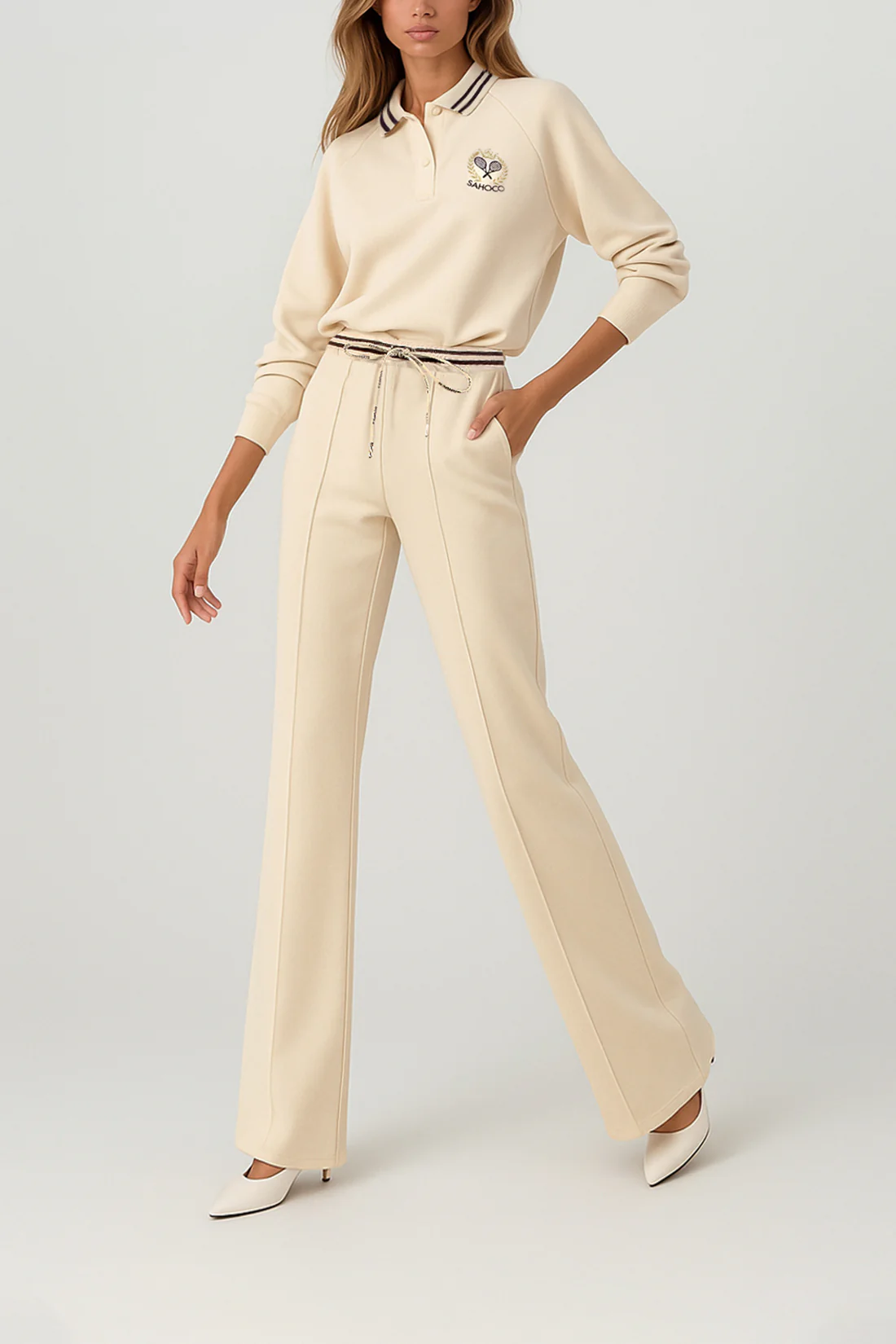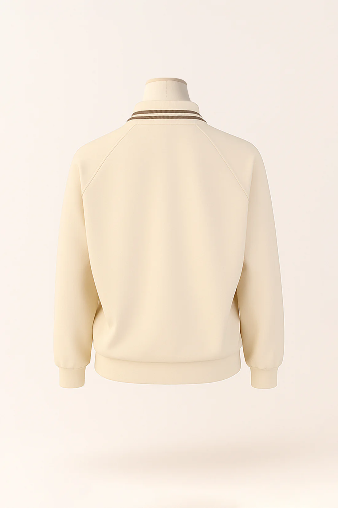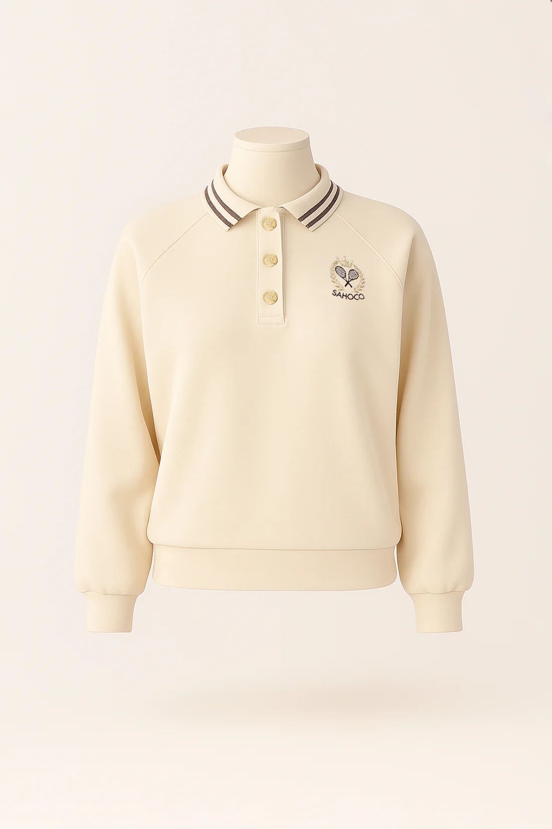 Sweater com gola de polo e manga comprida. Apresenta botões forrados e bordado exclusivo da marca, inspirado no universo college. Confeccionado em malha técnica suave, combina conforto, estrutura e sofisticação. Ideal para coordenar com as calças creme da mesma linha, traduzindo o espírito athleisure premium da coleção.