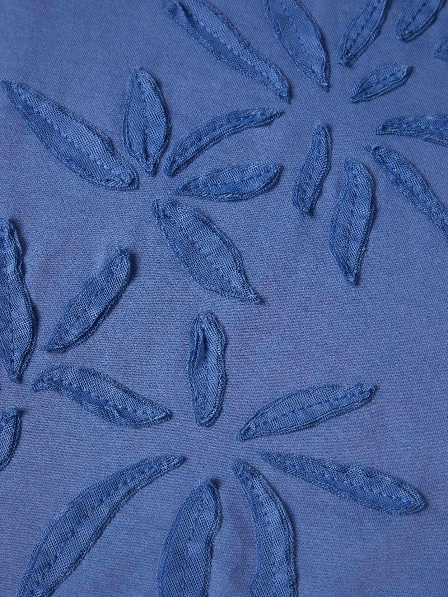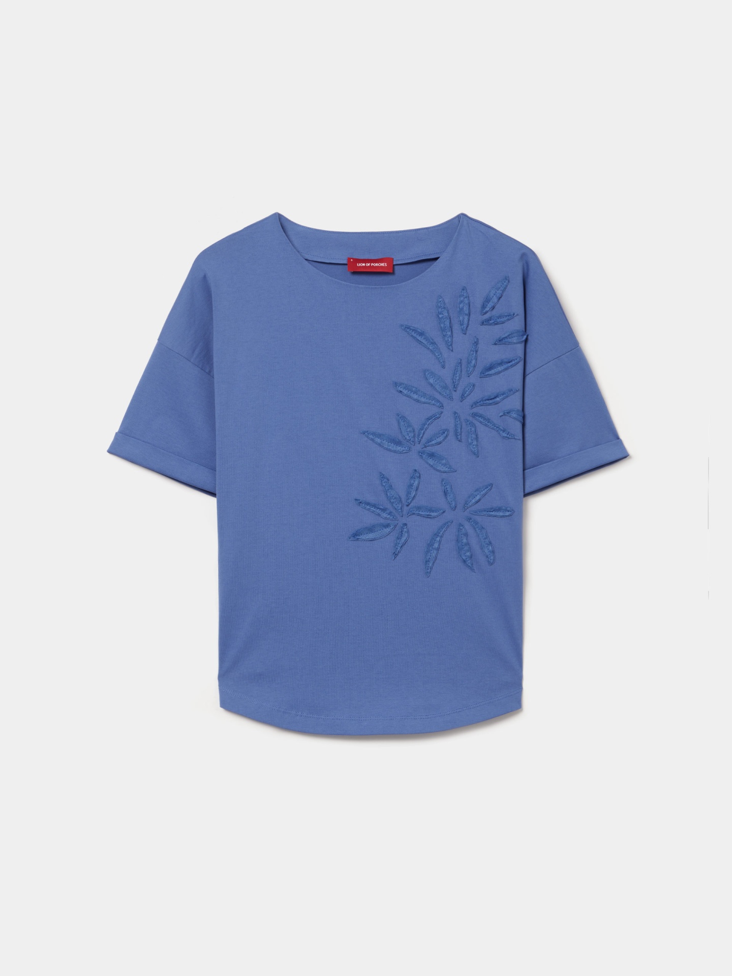 T-shirt de manga curta com decote redondo, confecionada em algodão. Destaca-se pela aplicação em tule e bordado em formas de folhas, que acrescenta textura e detalhe ao design. Apresenta mangas dobradas e bainha arredondada, conferindo um acabamento cuidado à peça.
