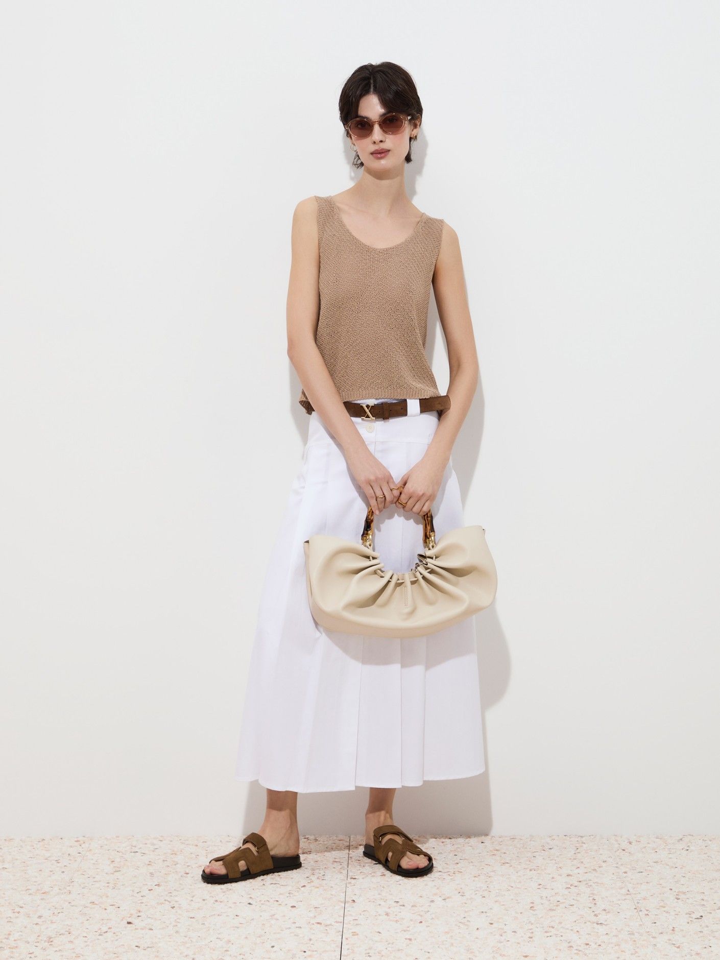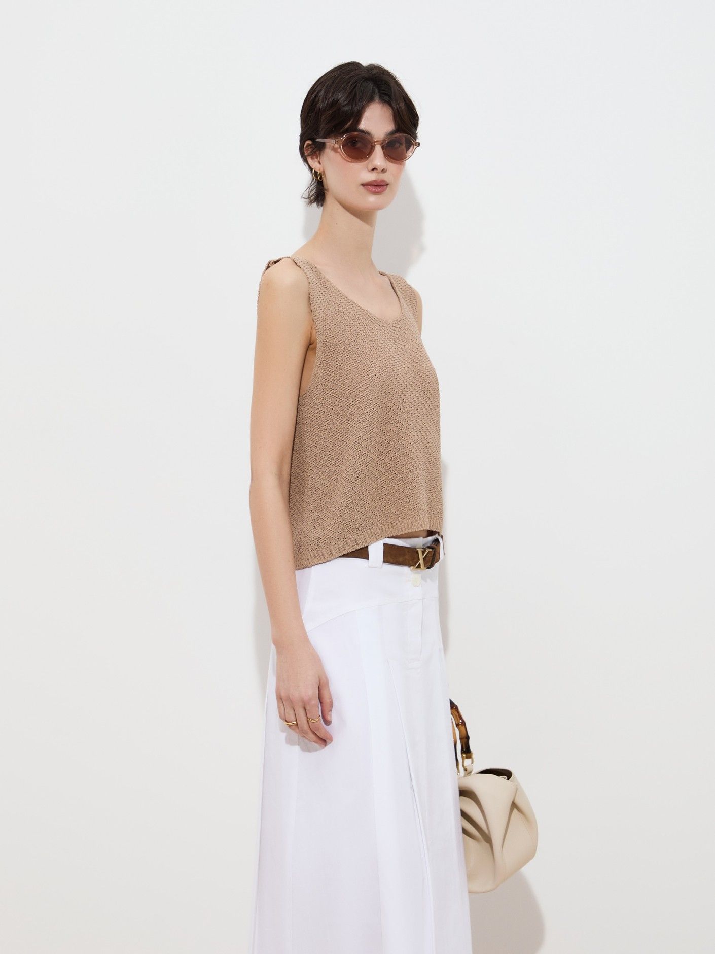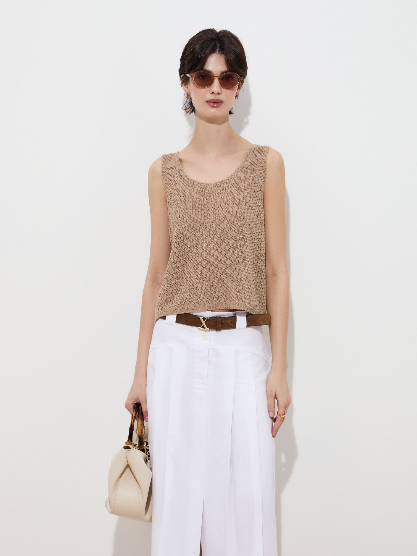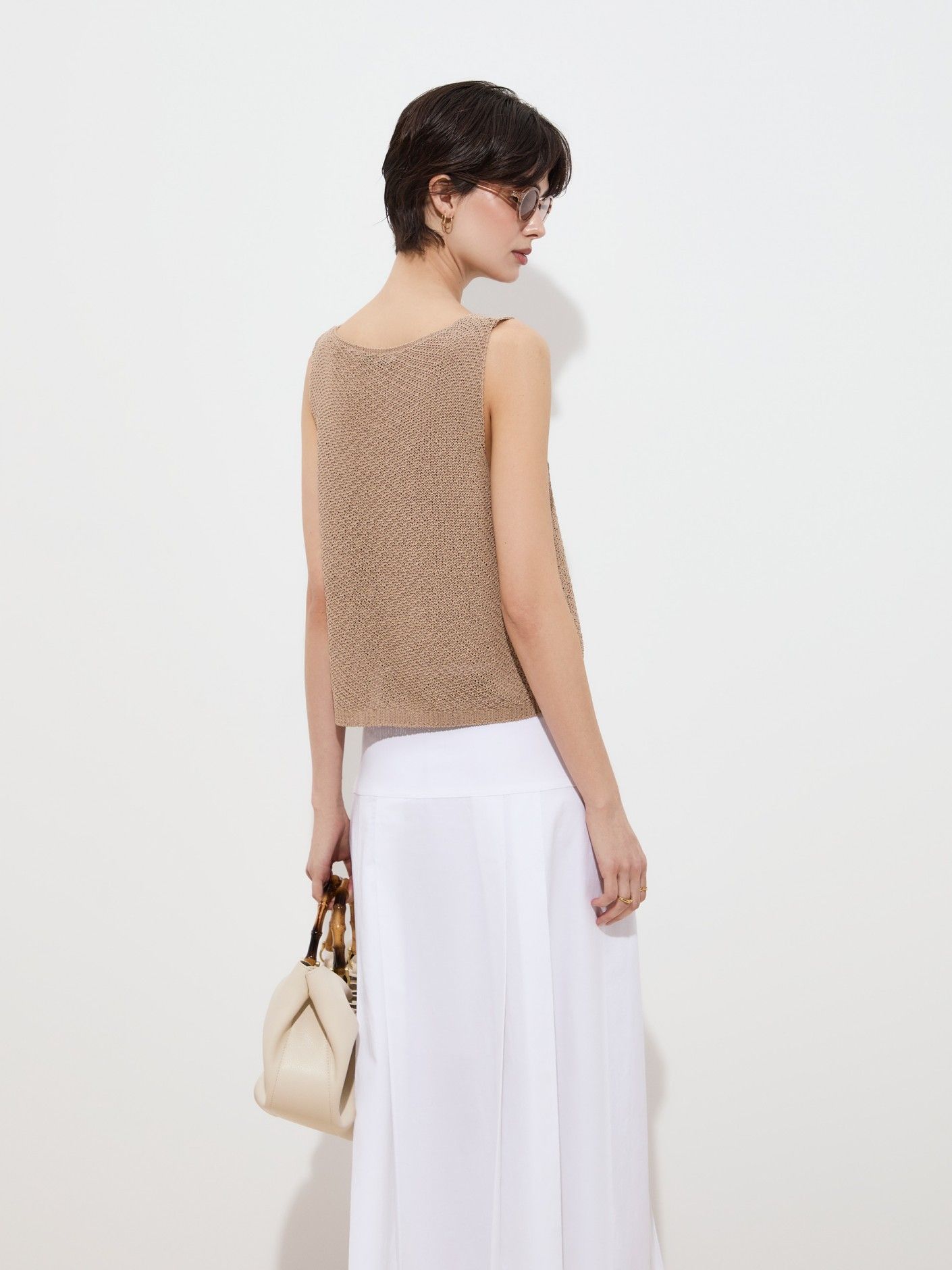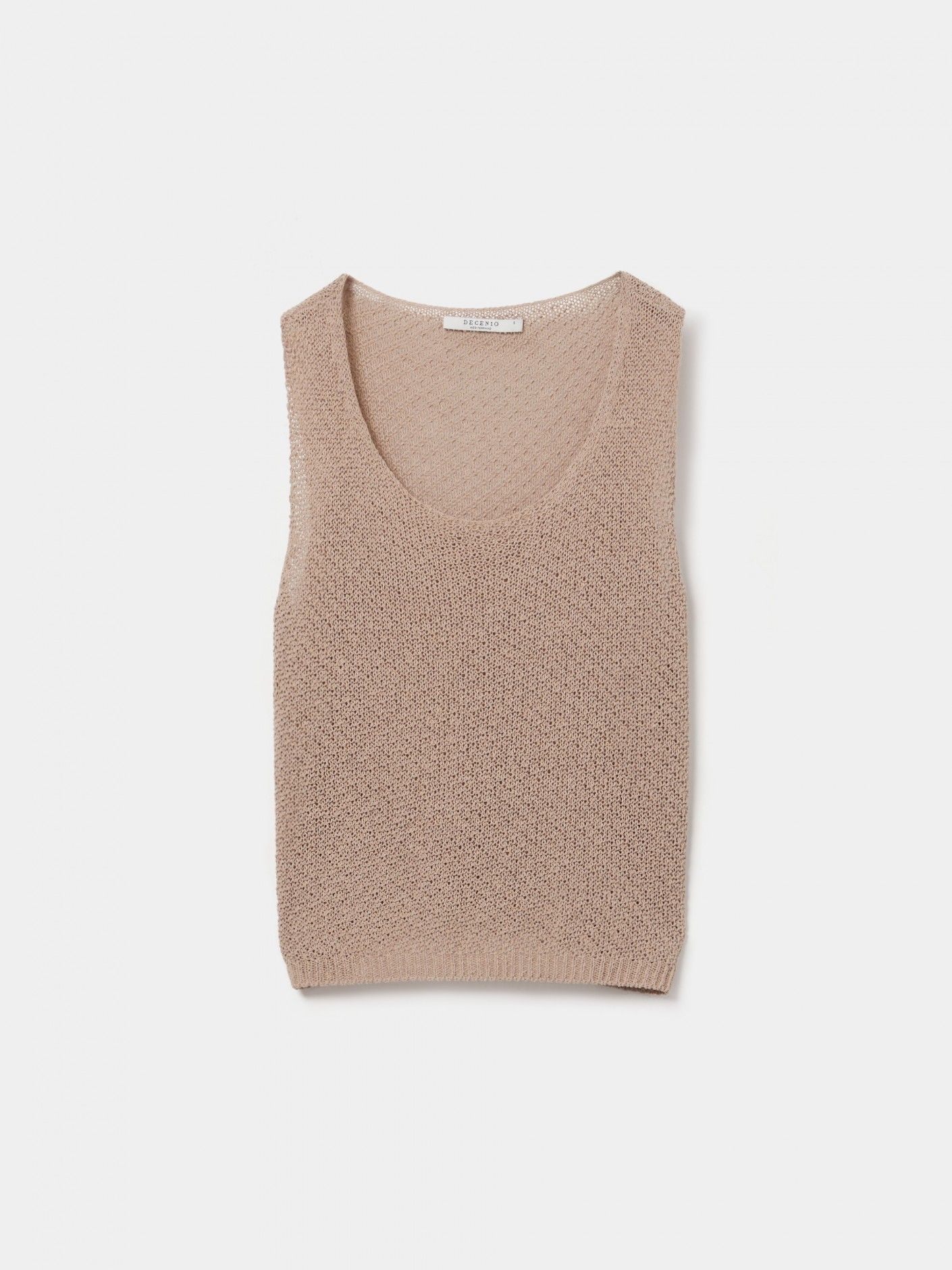 Top confecionado em malha tricotada suave. O modelo apresenta um decote redondo e um corte direito, proporcionando um ajuste confortável e descontraído. Uma peça elegante e versátil, perfeita para usar individualmente ou em conjunto com o casaco de malha de referência D005172 para um visual monocromático sofisticado.