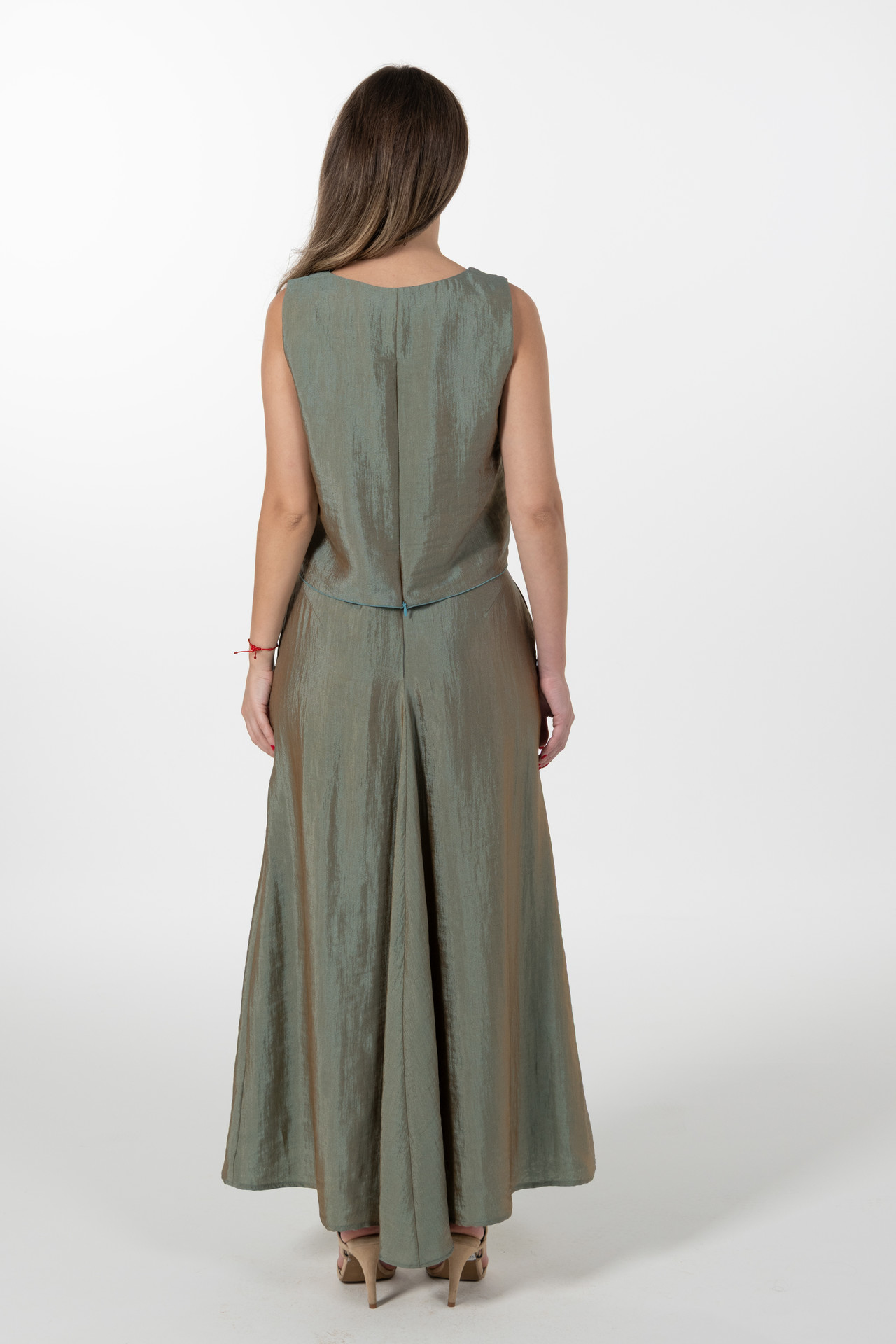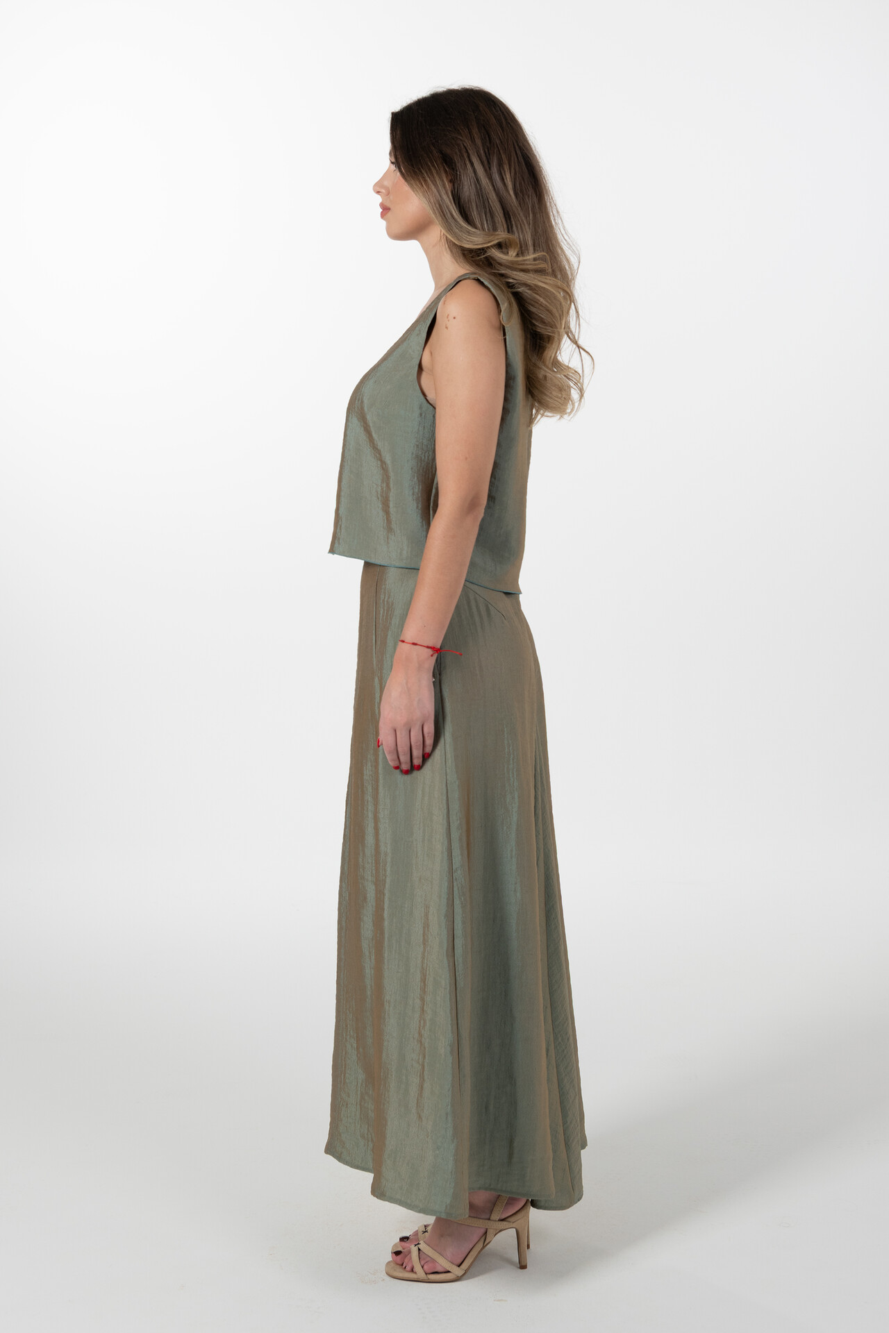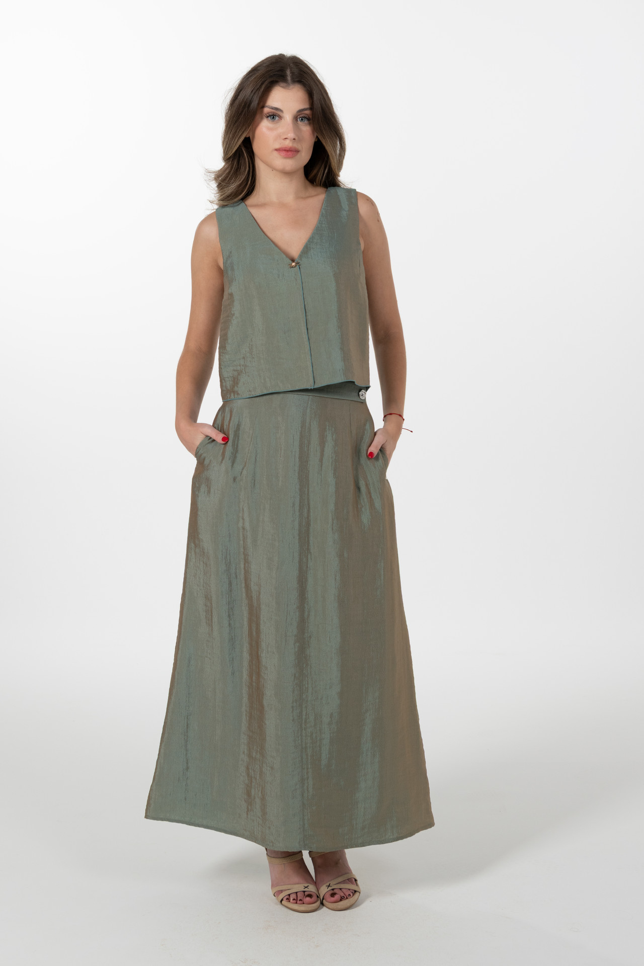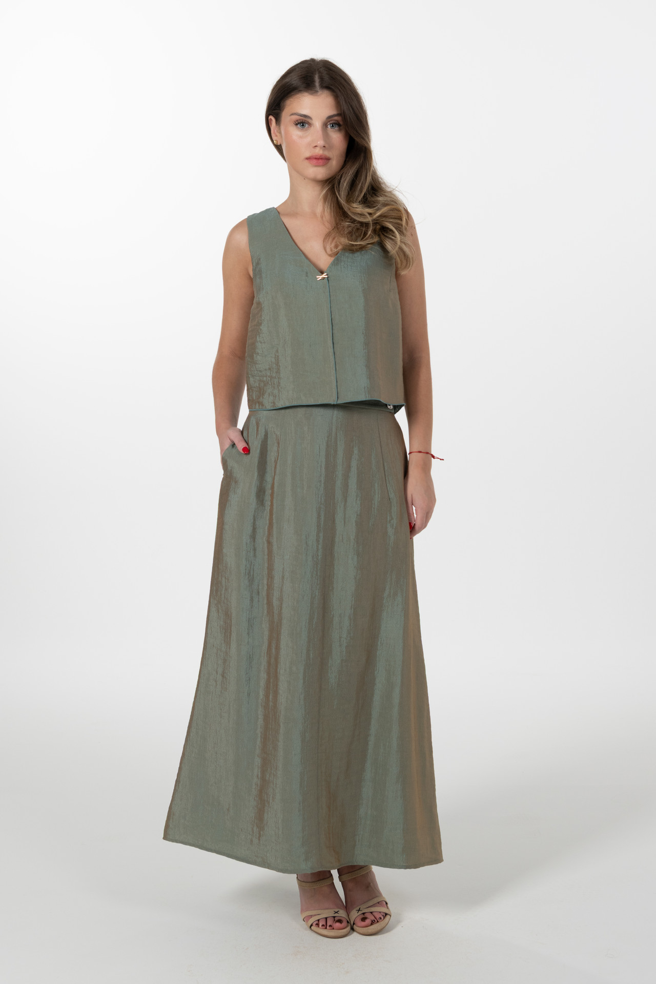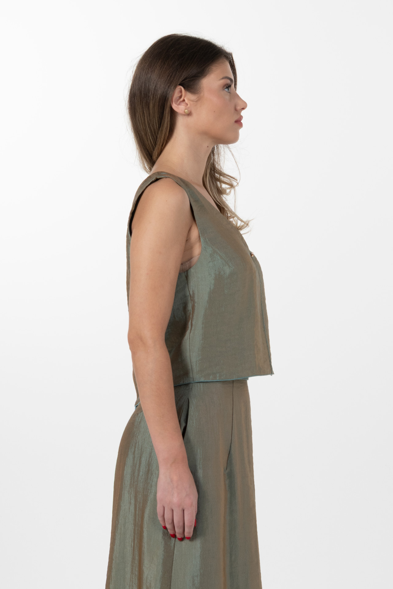 Top sem mangas com decote em V, destacando-se pela aplicação no decote que acrescenta um toque sofisticado. Aperta na costa com fecho, garantindo um ajuste confortável e um acabamento discreto. Combina com a saia da mesma coleção, criando um conjunto elegante e harmonioso.