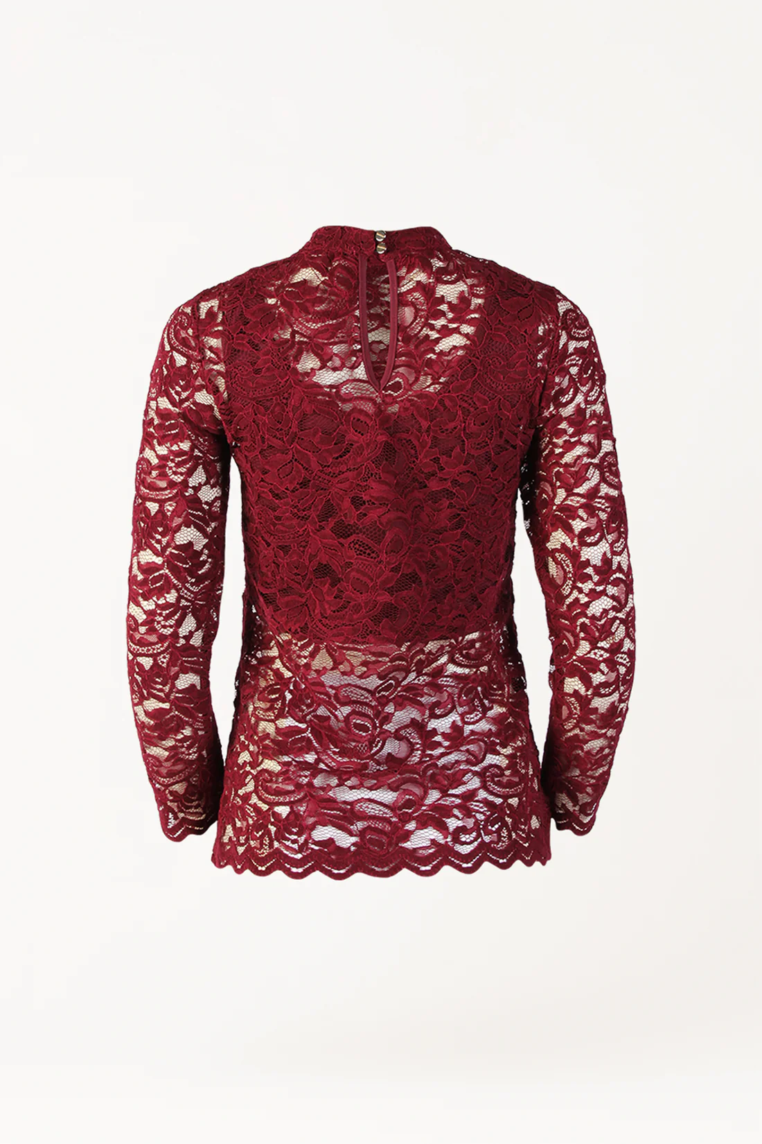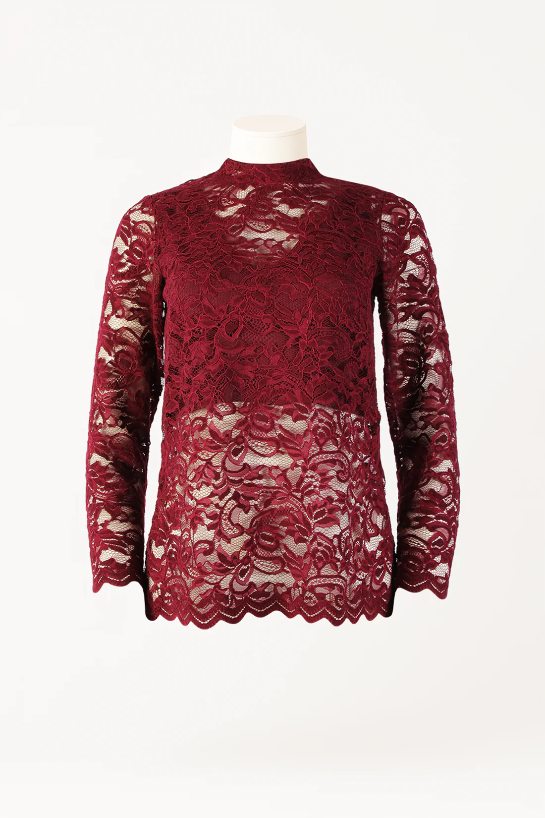 Top em renda floral de leve elasticidade, com gola subida e mangas compridas. O desenho revela o contraste entre textura e transparência, enquanto as bainhas em recorte rendado mantêm a pureza do material. Uma peça leve, precisa e versátil, feita para sobreposições subtis ou coordenados mais estruturados.