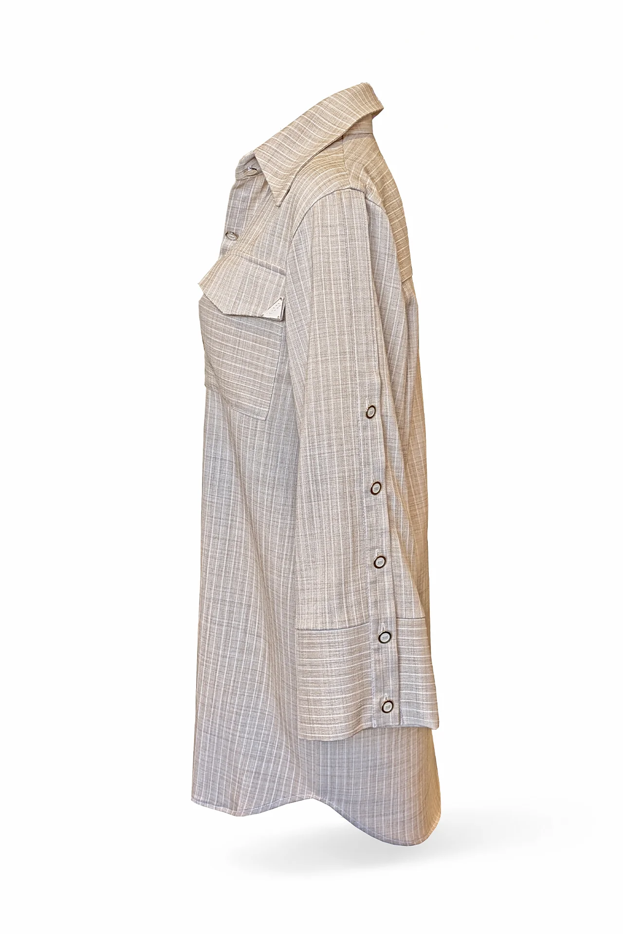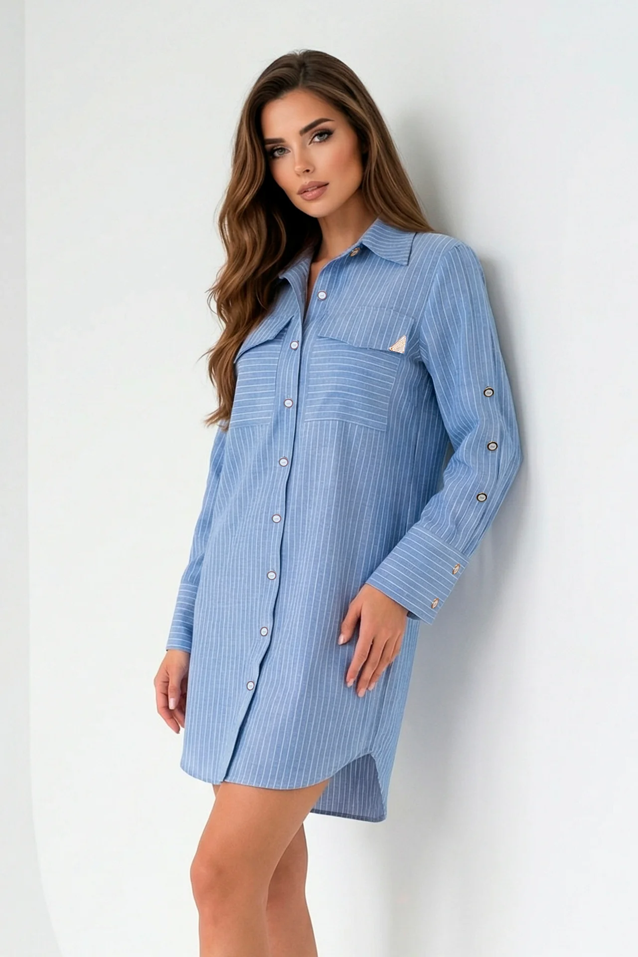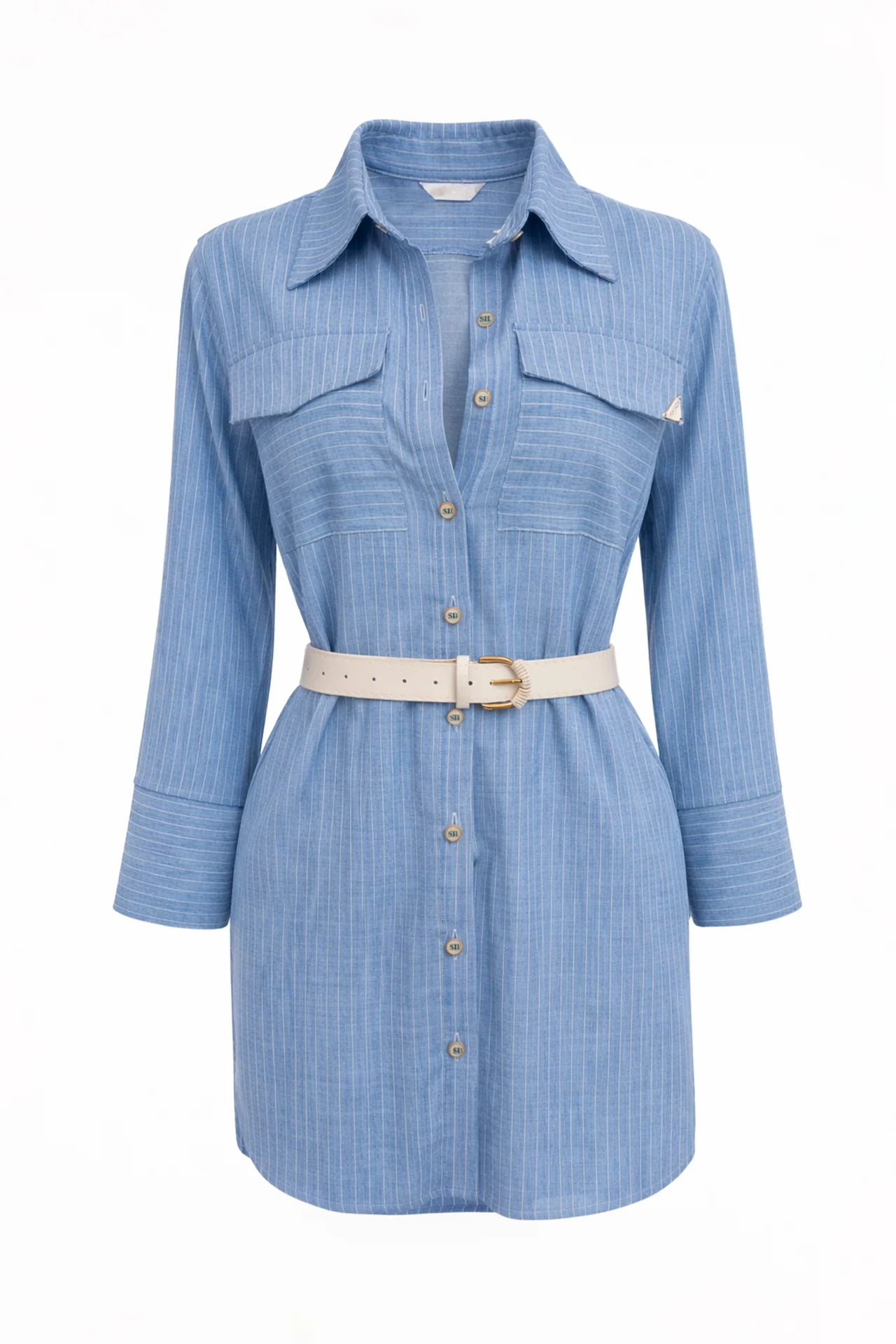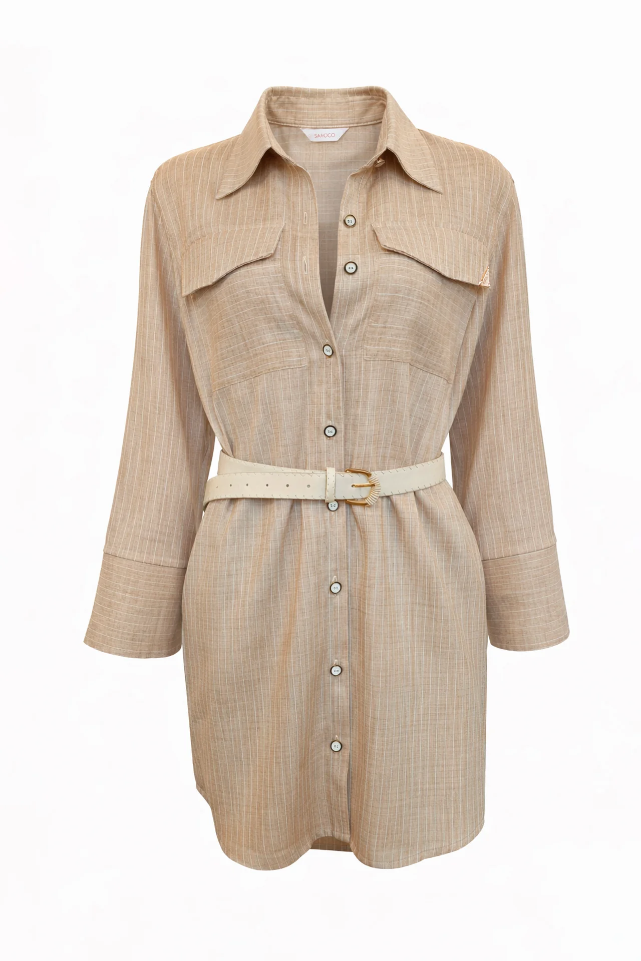 Vestido curto tipo camisa com colarinho e manga comprida. Fecho frontal com botões e bolsos com aba no peito. Cinto removível a contrastar para ajustar a silhueta e detalhe de botões na lateral das mangas.