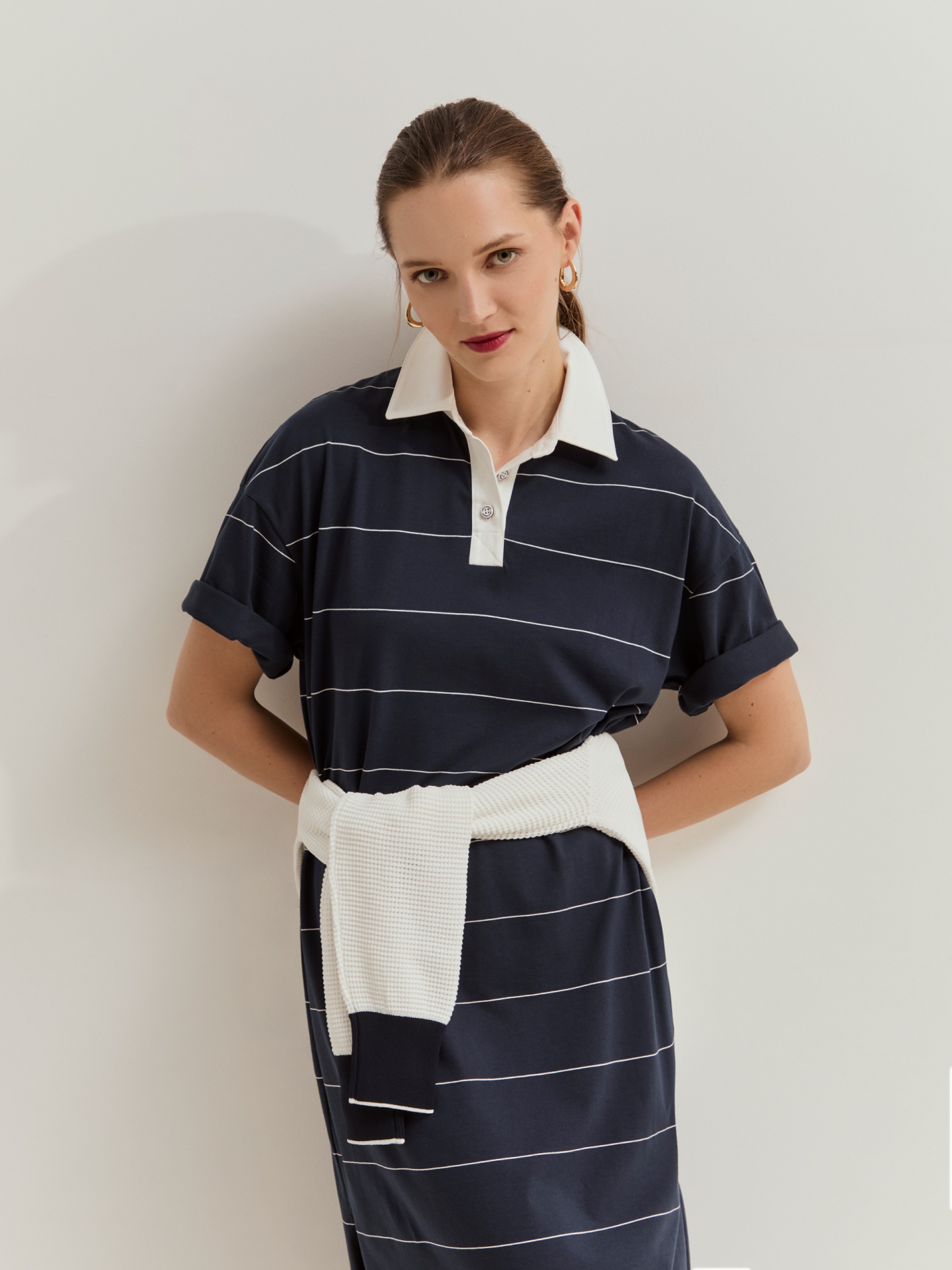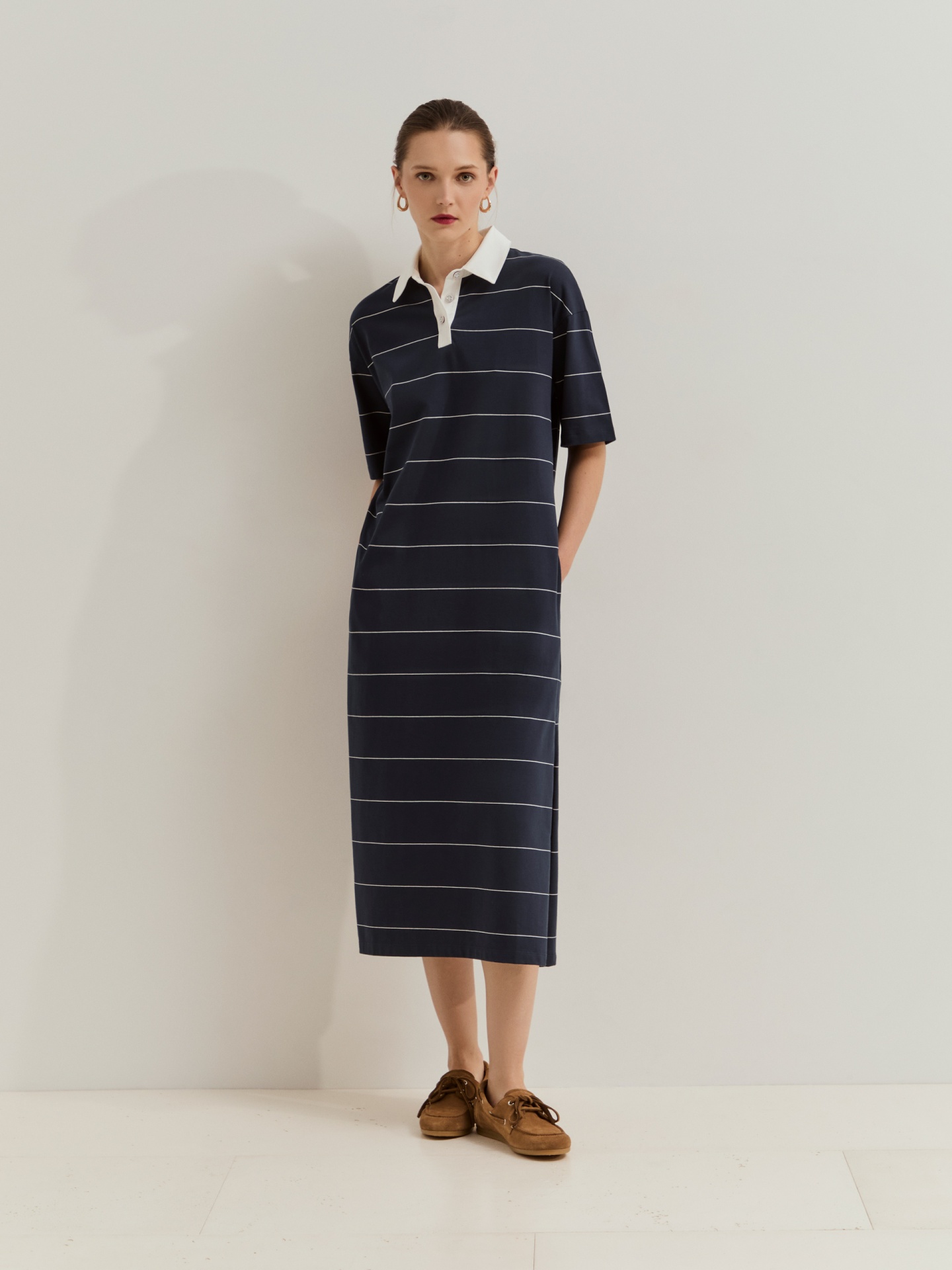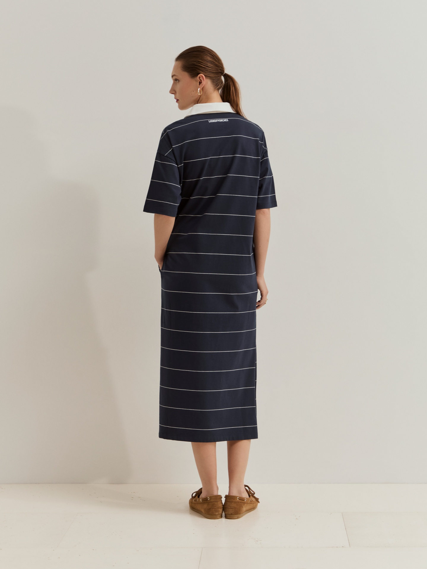 Vestido comprido de manga curta em malha de riscas, pensado para um visual confortável e atual. Apresenta pé de gola, gola e carcela em tecido de contraste. As rachas laterais na base conferem maior fluidez e liberdade de movimentos. O nome da marca, aplicado de forma discreta no cimo das costas em cor contrastante, finaliza a peça com um toque distintivo. Um vestido versátil, ideal para o dia a dia com estilo.