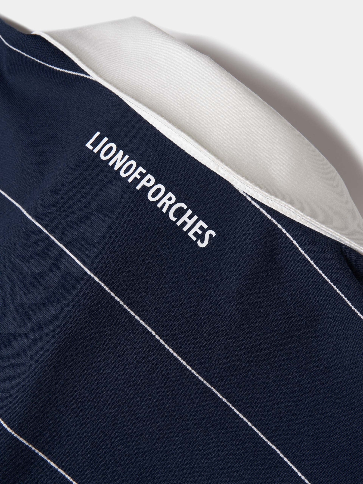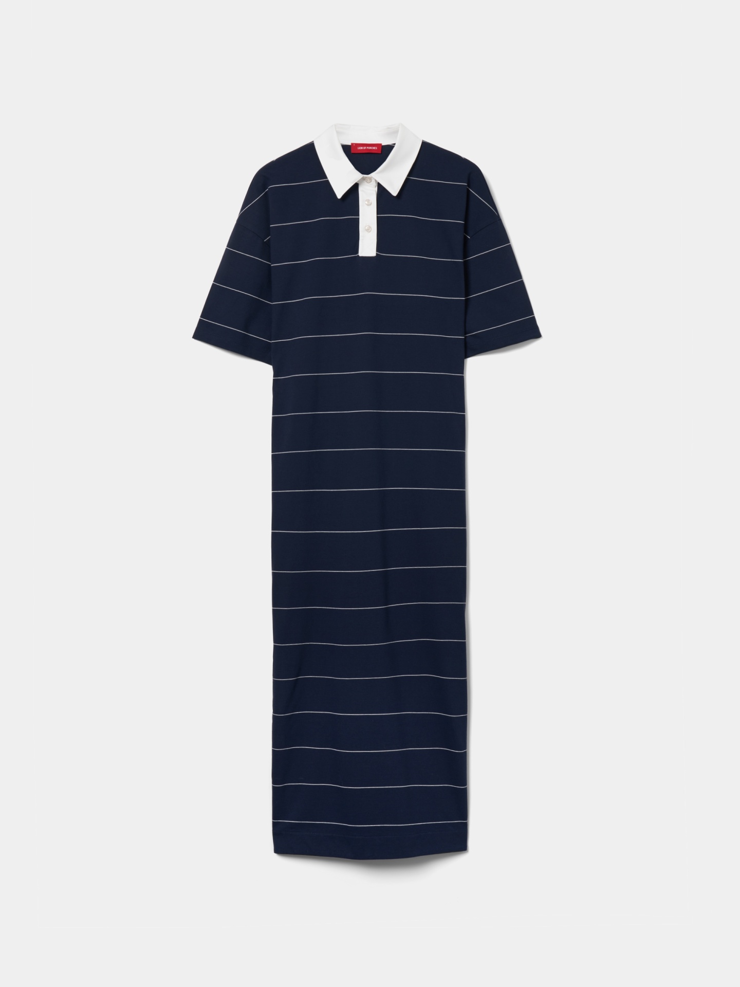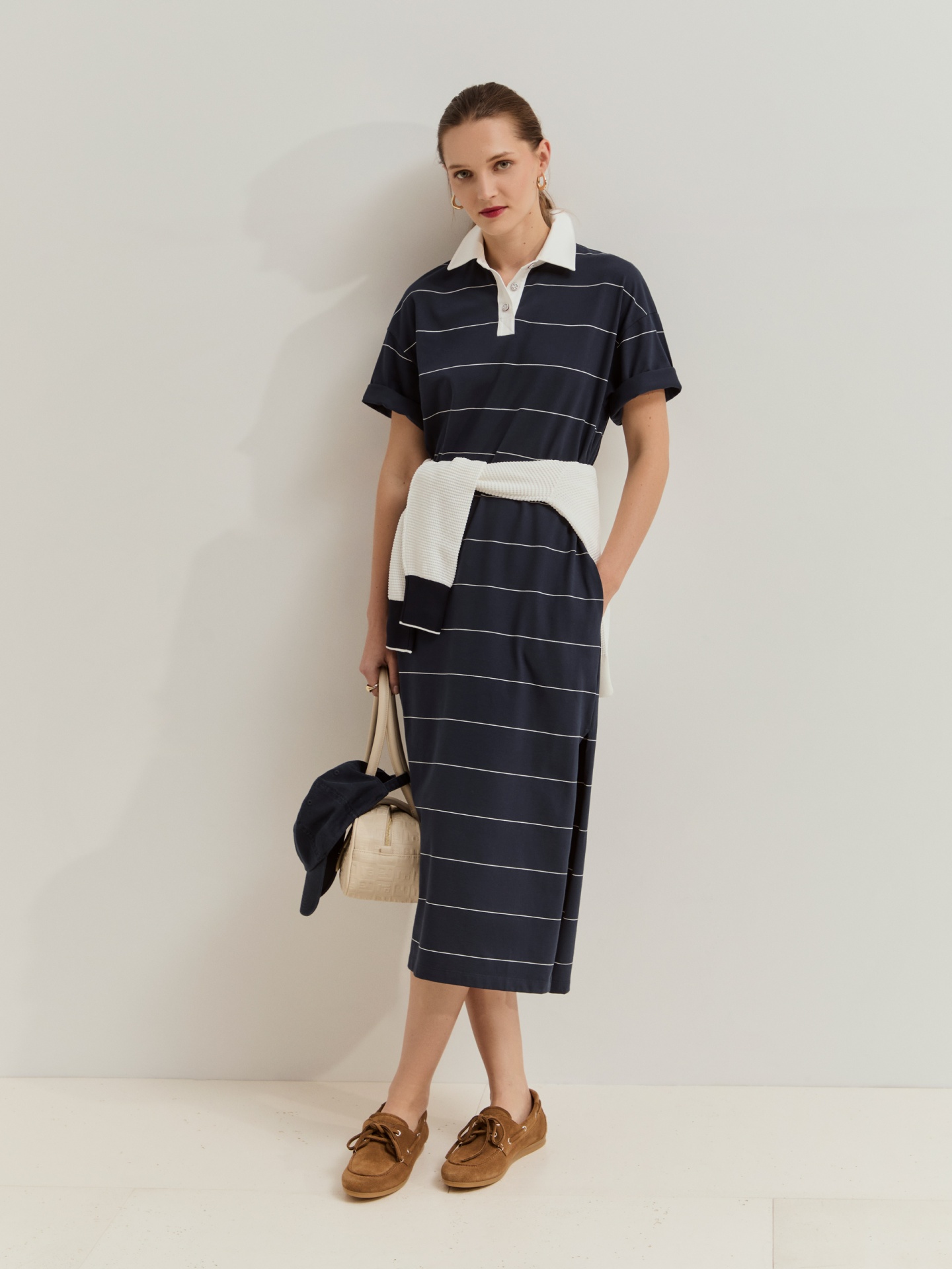 Vestido comprido de manga curta em malha de riscas, pensado para um visual confortável e atual. Apresenta pé de gola, gola e carcela em tecido de contraste. As rachas laterais na base conferem maior fluidez e liberdade de movimentos. O nome da marca, aplicado de forma discreta no cimo das costas em cor contrastante, finaliza a peça com um toque distintivo. Um vestido versátil, ideal para o dia a dia com estilo.