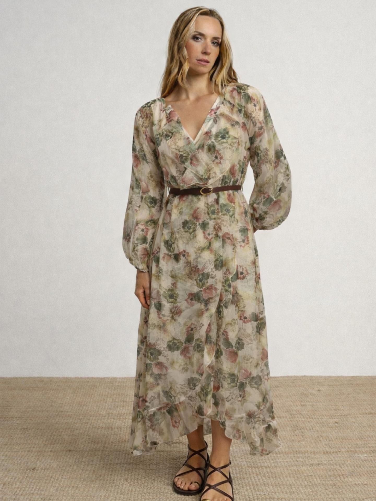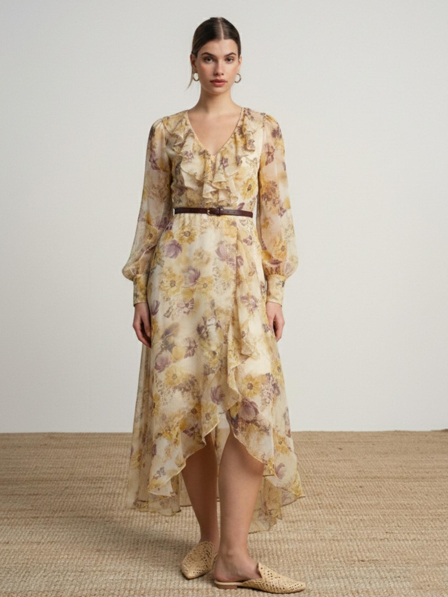 Vestido de corte fluido em tecido leve com estampado floral. Modelo com decote em V e detalhe de folhos frontais. Manga comprida com volume e punho ajustado. Cintura marcada com cinto fino.