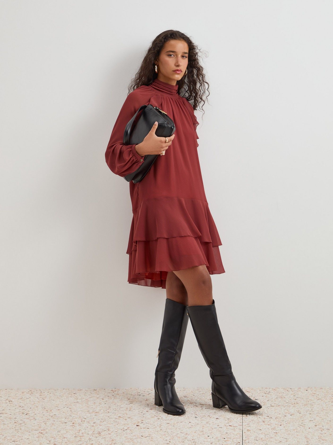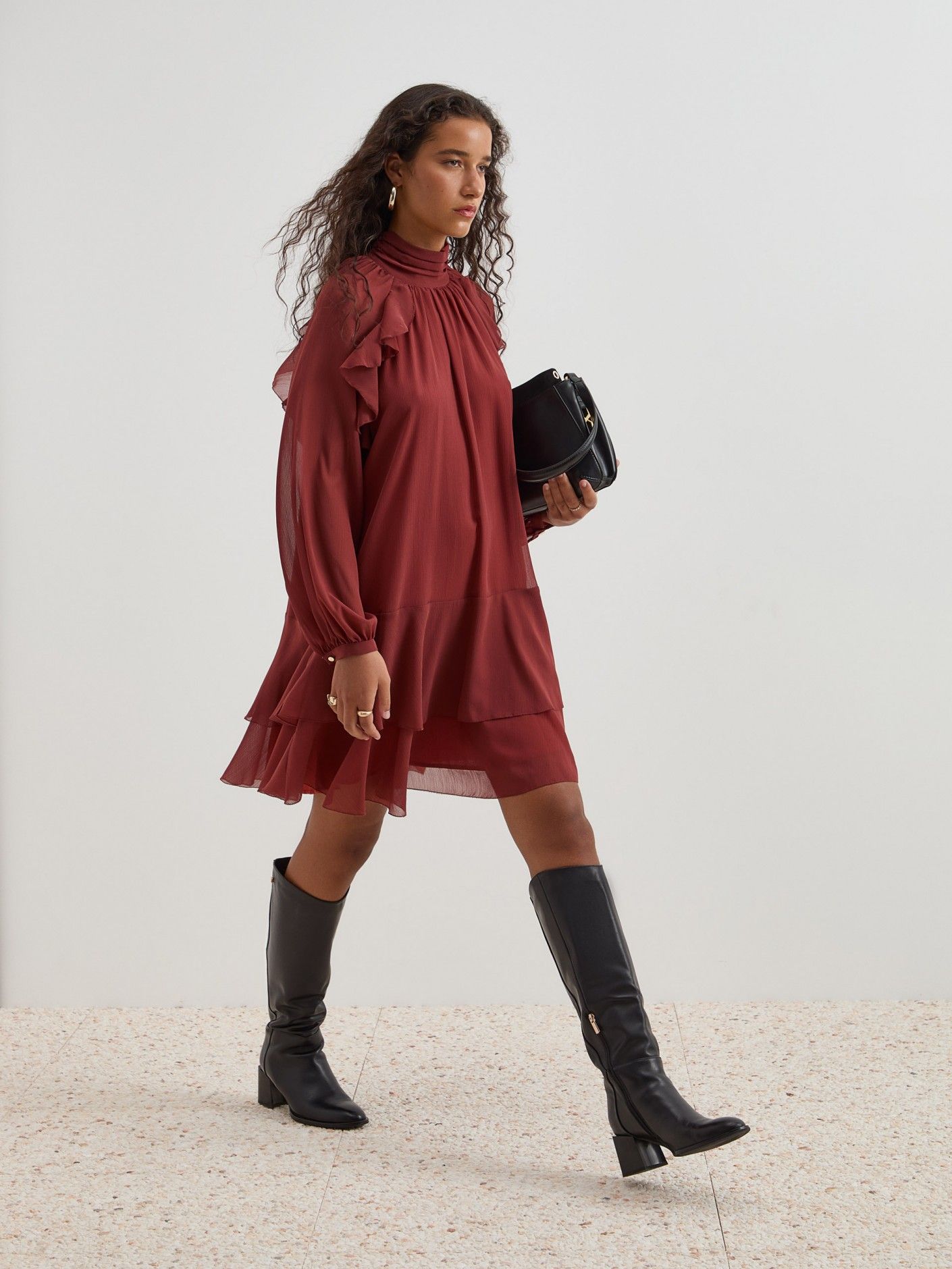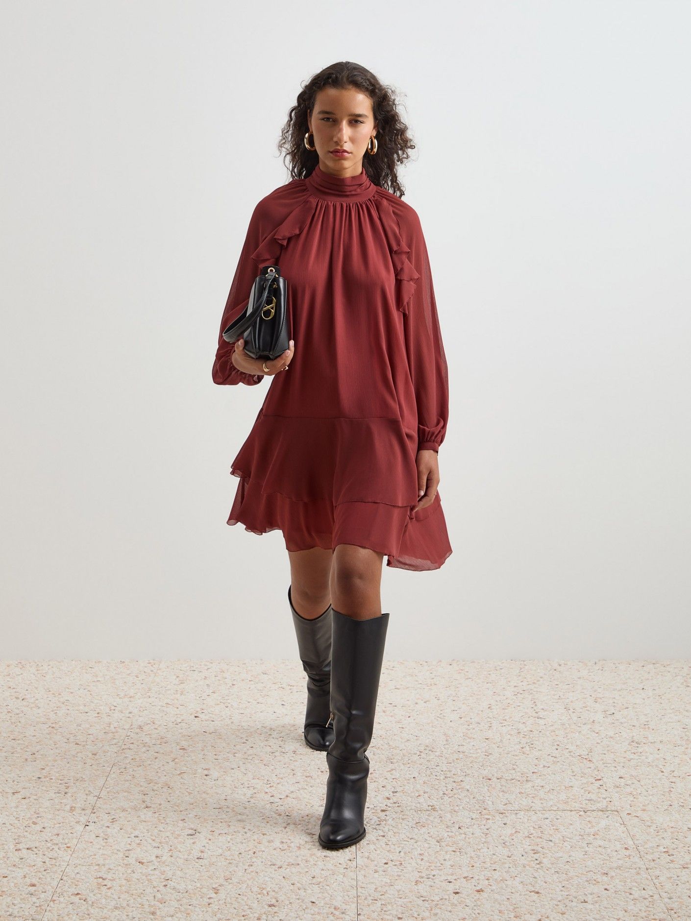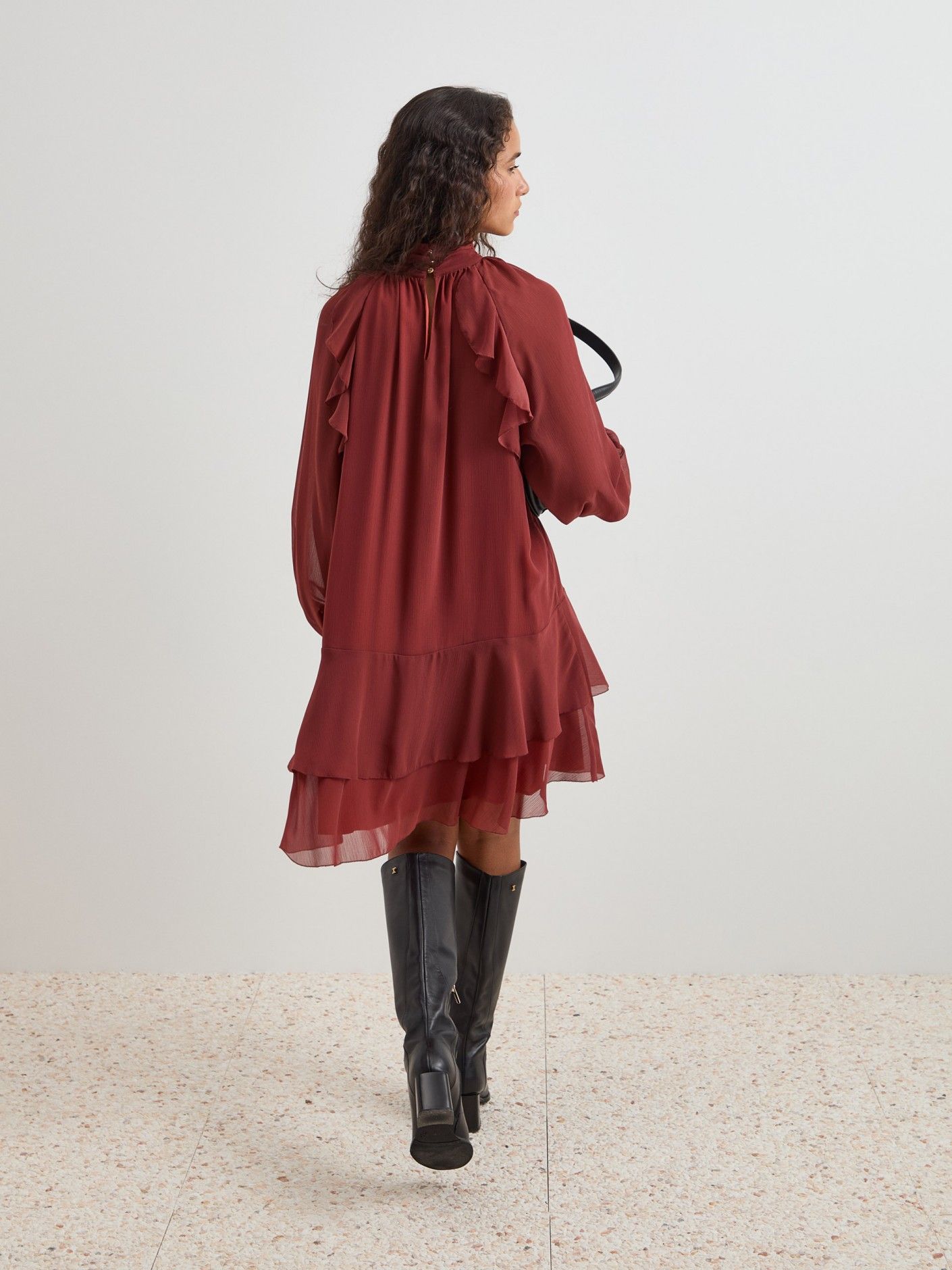 Delicado e elegante, este vestido curto fluído destaca-se pelos folhos e franzidos que conferem movimento e feminilidade. A gola franzida com abertura traseira por botões gun metal personalizados adiciona um detalhe sofisticado, enquanto a manga comprida raglan com punho ajustável garante conforto e caimento perfeito. Vestido totalmente forrado, ideal para looks elegantes do dia a dia ou ocasiões especiais.
