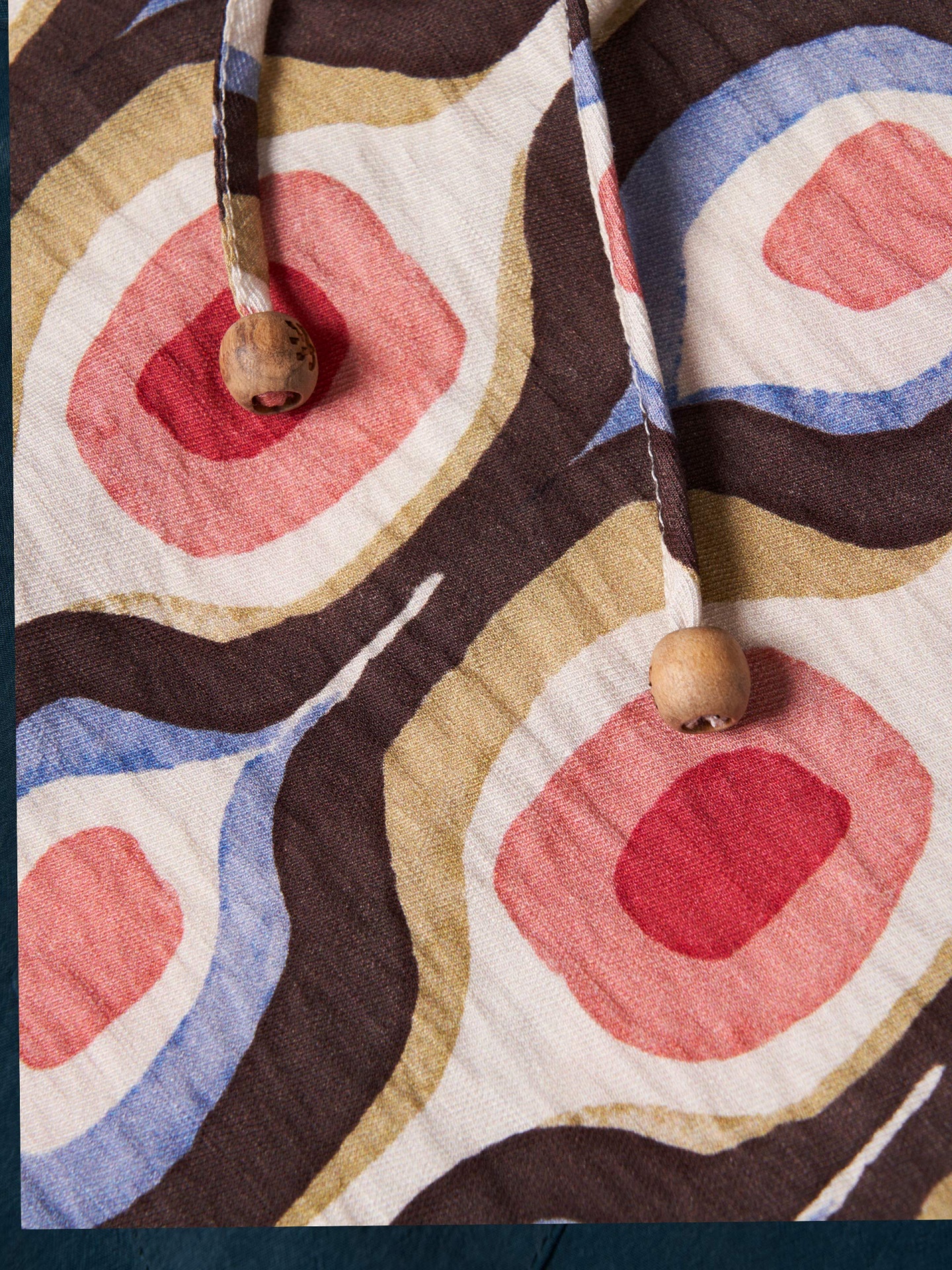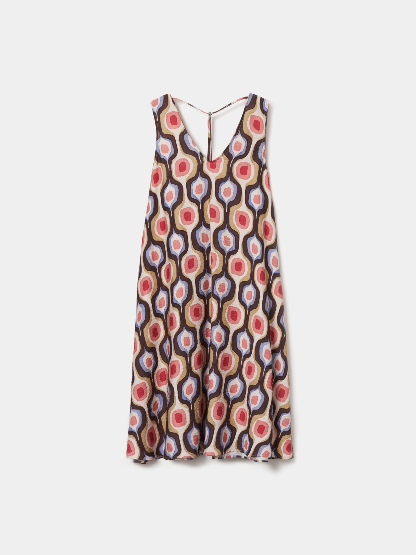Vestido curto fluído com decote em V na frente e nas costas. Apresenta cordões nas costas com ponteiras de madeira personalizadas para apertar. Bolsos discretos nas costuras laterais acrescentam funcionalidade. O estampado multicolor confere um toque vibrante e moderno. Uma peça leve, feminina e versátil.