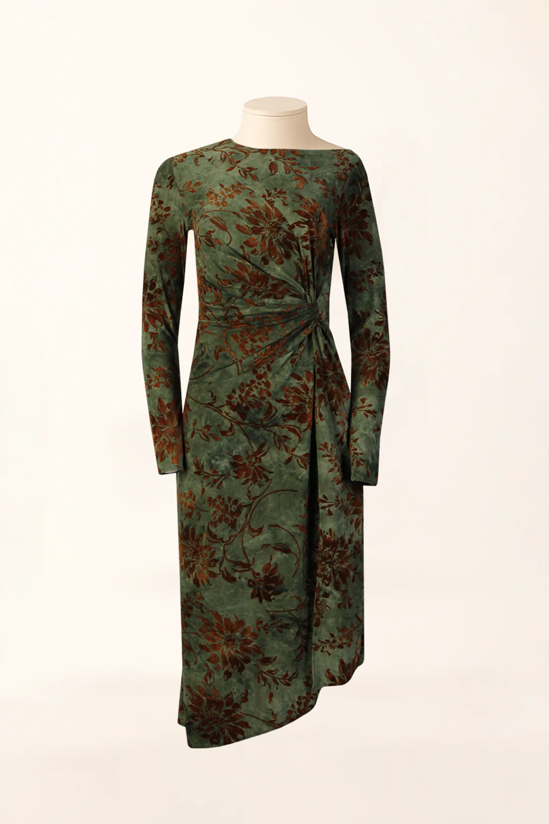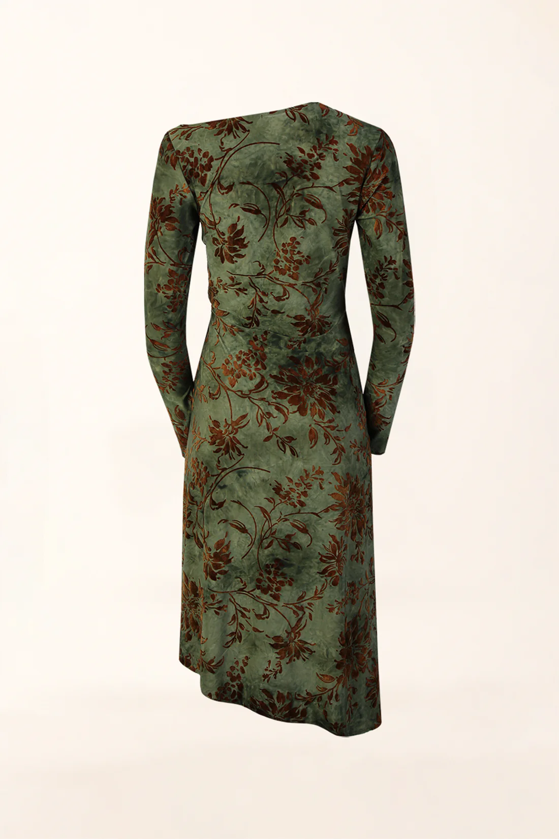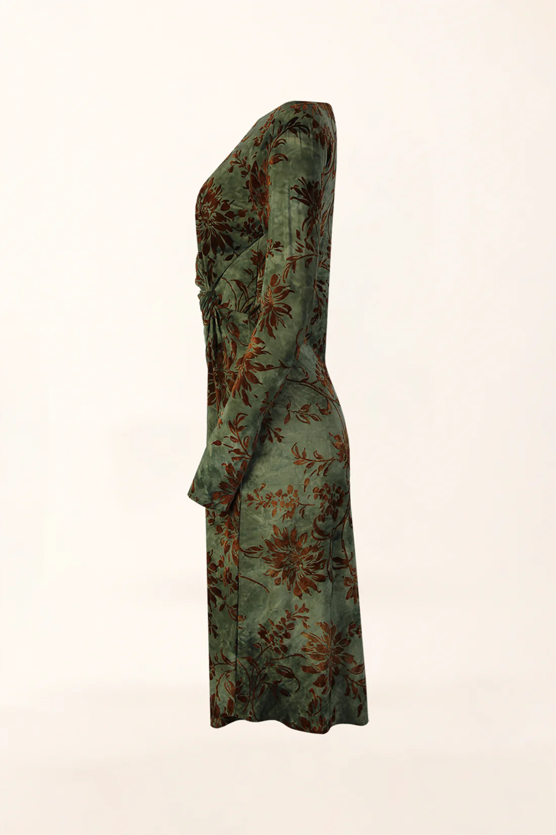 Vestido midi em veludo devoré com padrão floral em tons ricos. O design de manga comprida e decote redondo é complementado por um nó lateral que define a cintura e cria um drapeado elegante. A assimetria subtil na bainha acrescenta leveza e movimento à silhueta.
