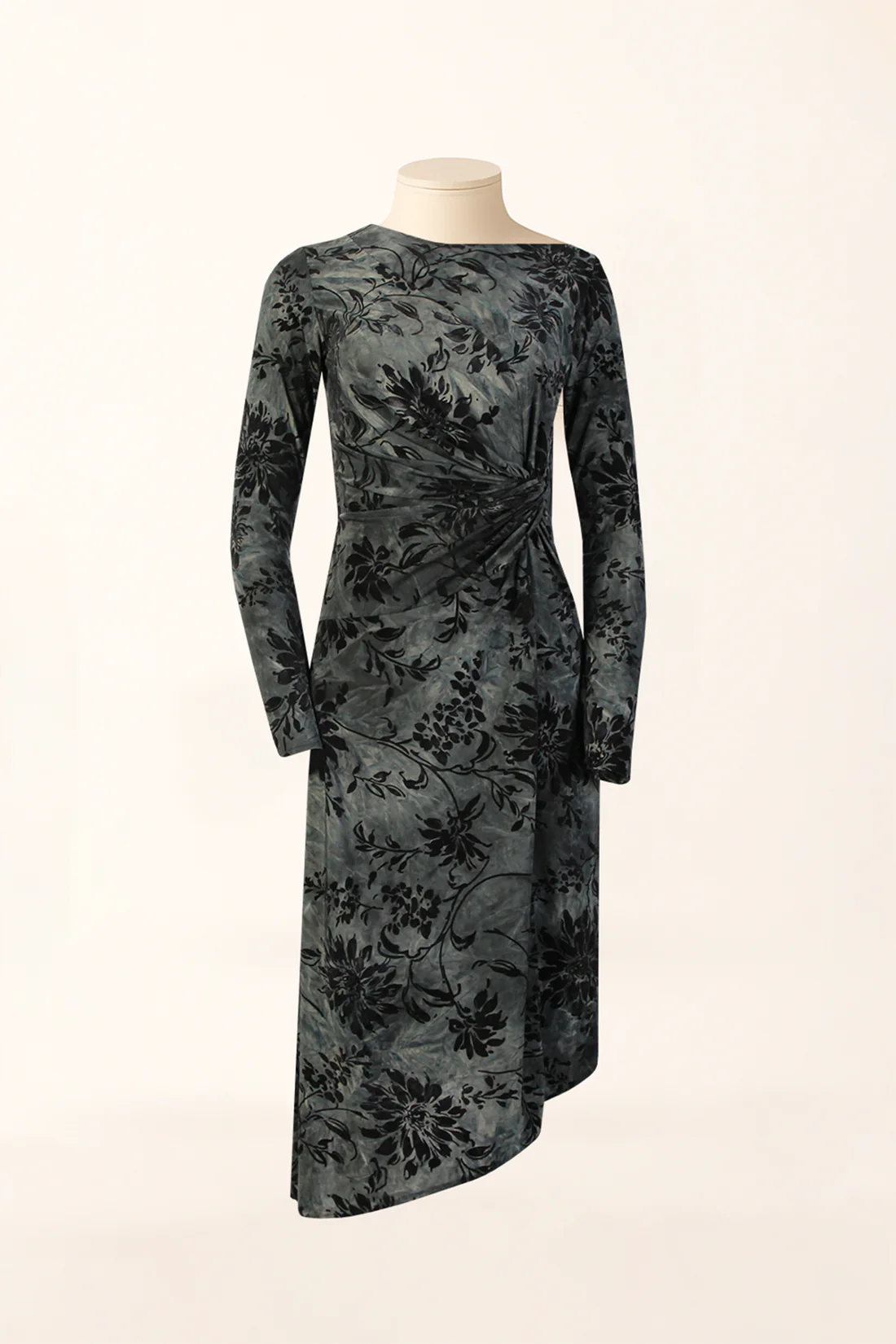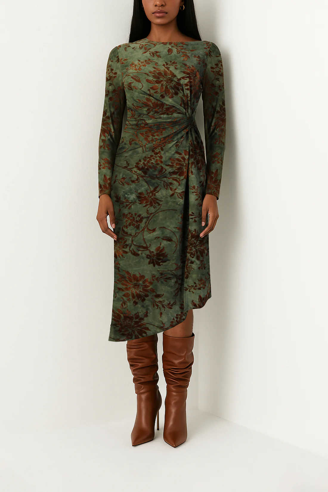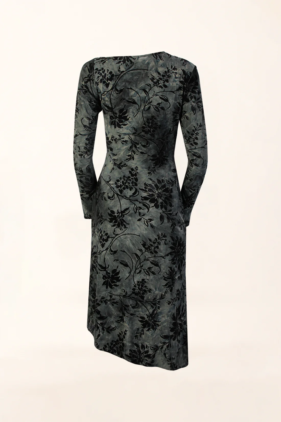 Vestido midi em veludo devoré com padrão floral em tons ricos. O design de manga comprida e decote redondo é complementado por um nó lateral que define a cintura e cria um drapeado elegante. A assimetria subtil na bainha acrescenta leveza e movimento à silhueta.
