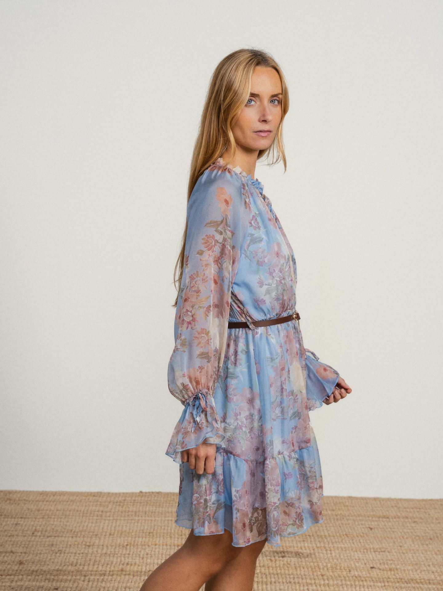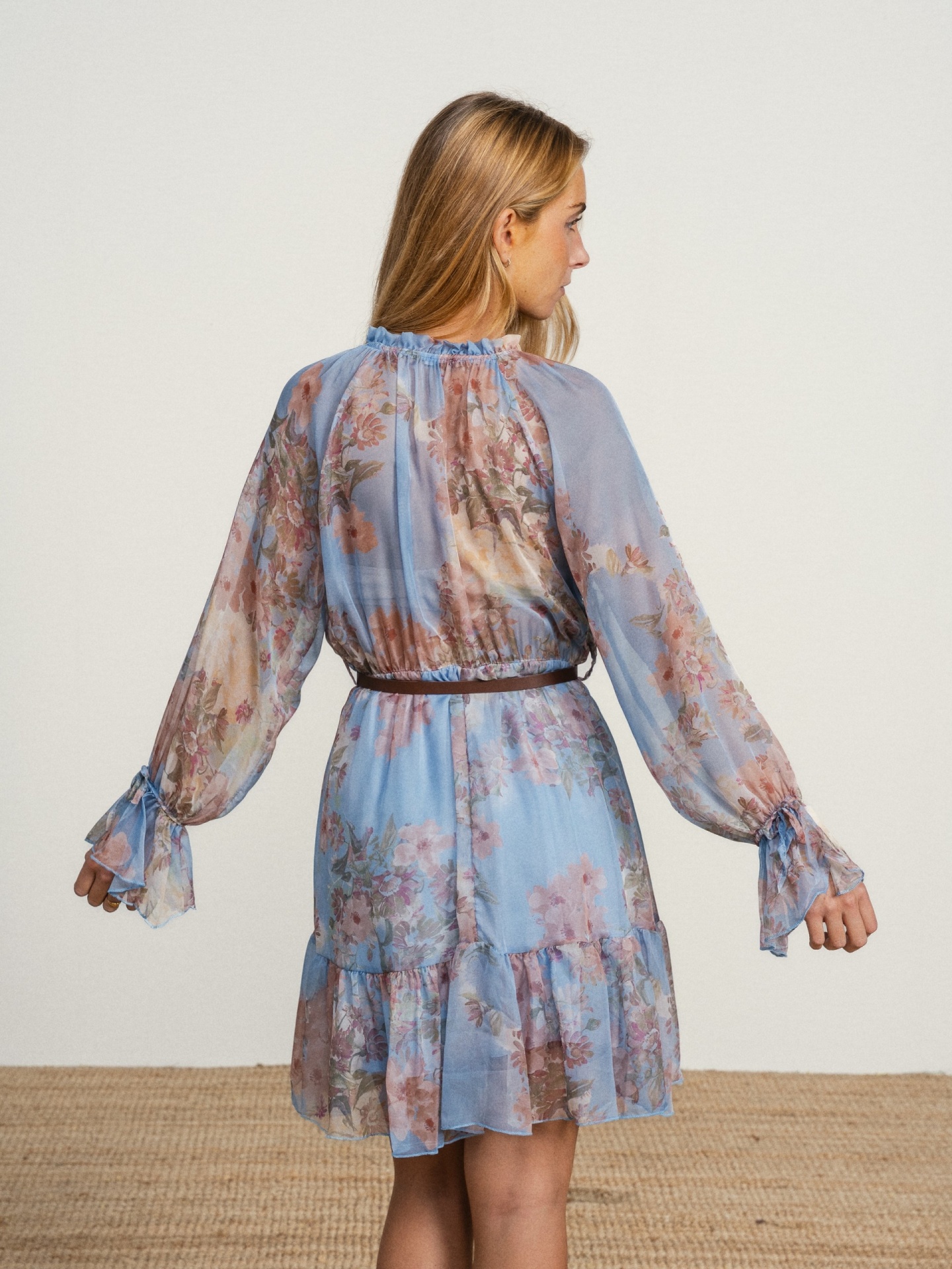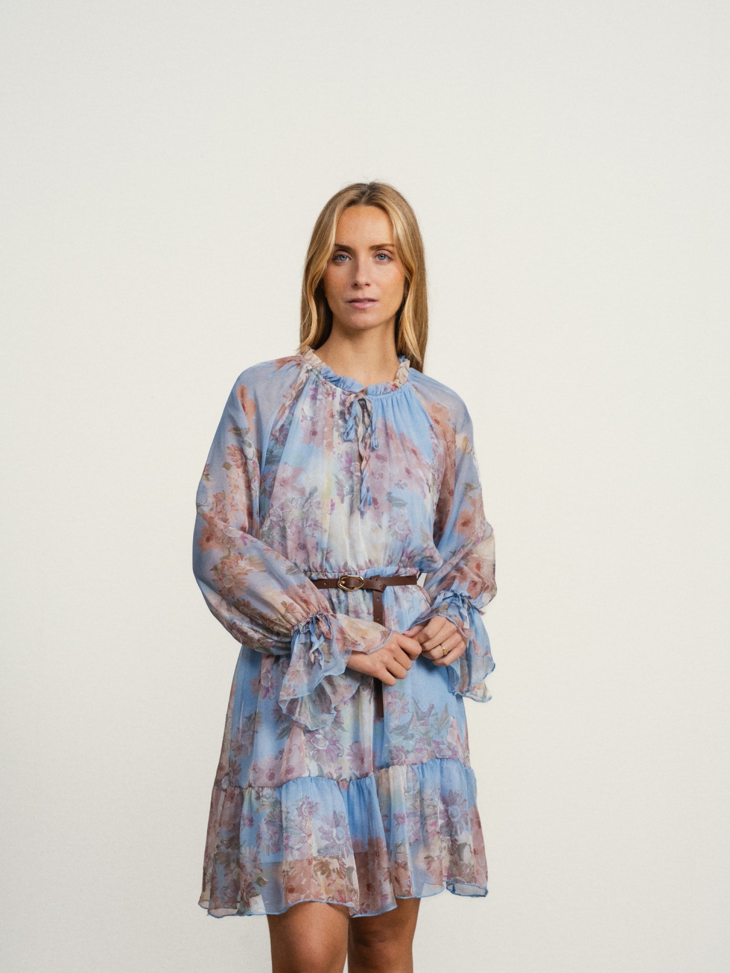 Vestido de corte fluido em tecido leve com estampado em tons suaves. Modelo com decote franzido com cordões para atar e manga comprida com volume. Detalhe de folhos na base que acrescenta movimento.