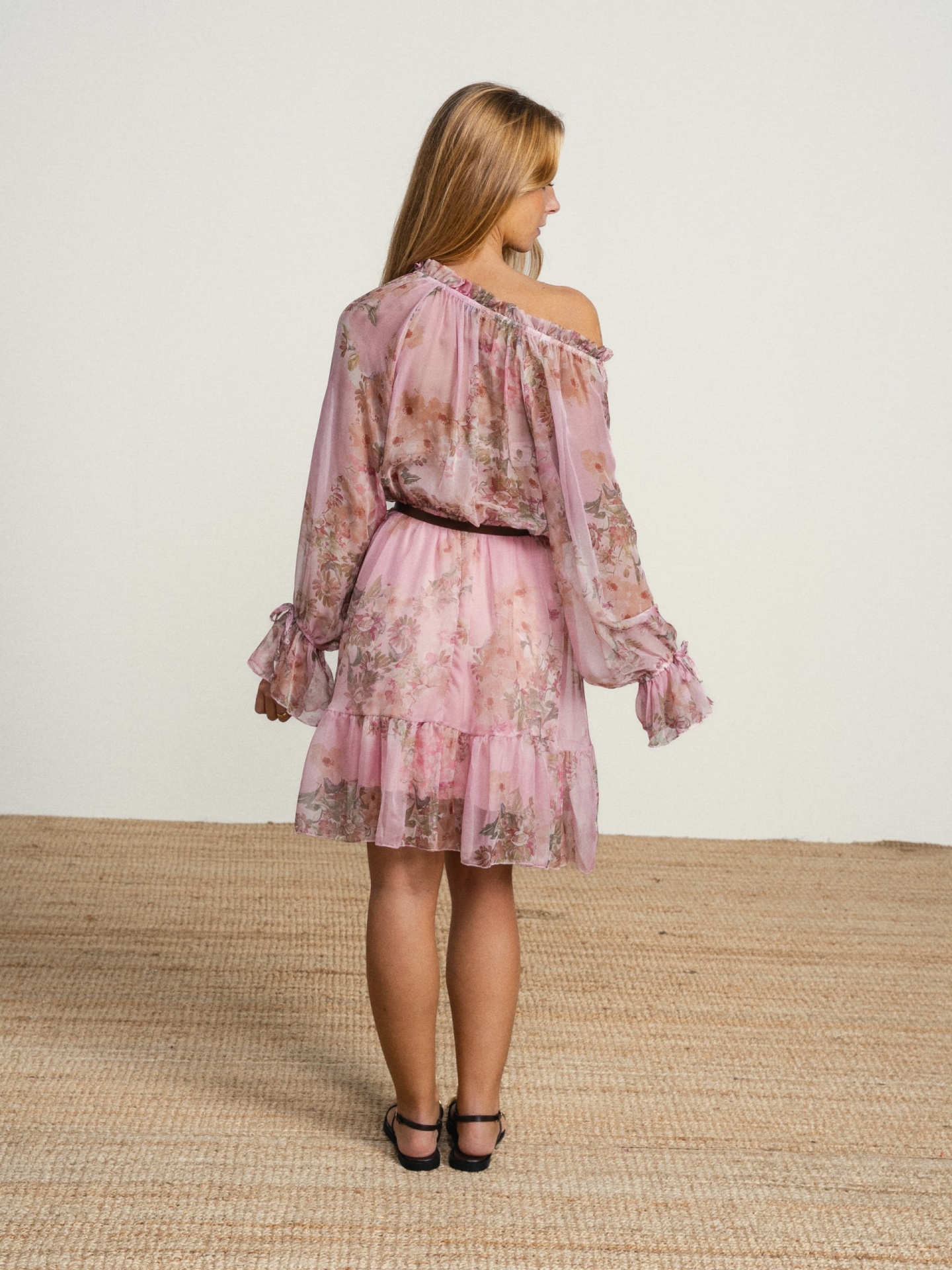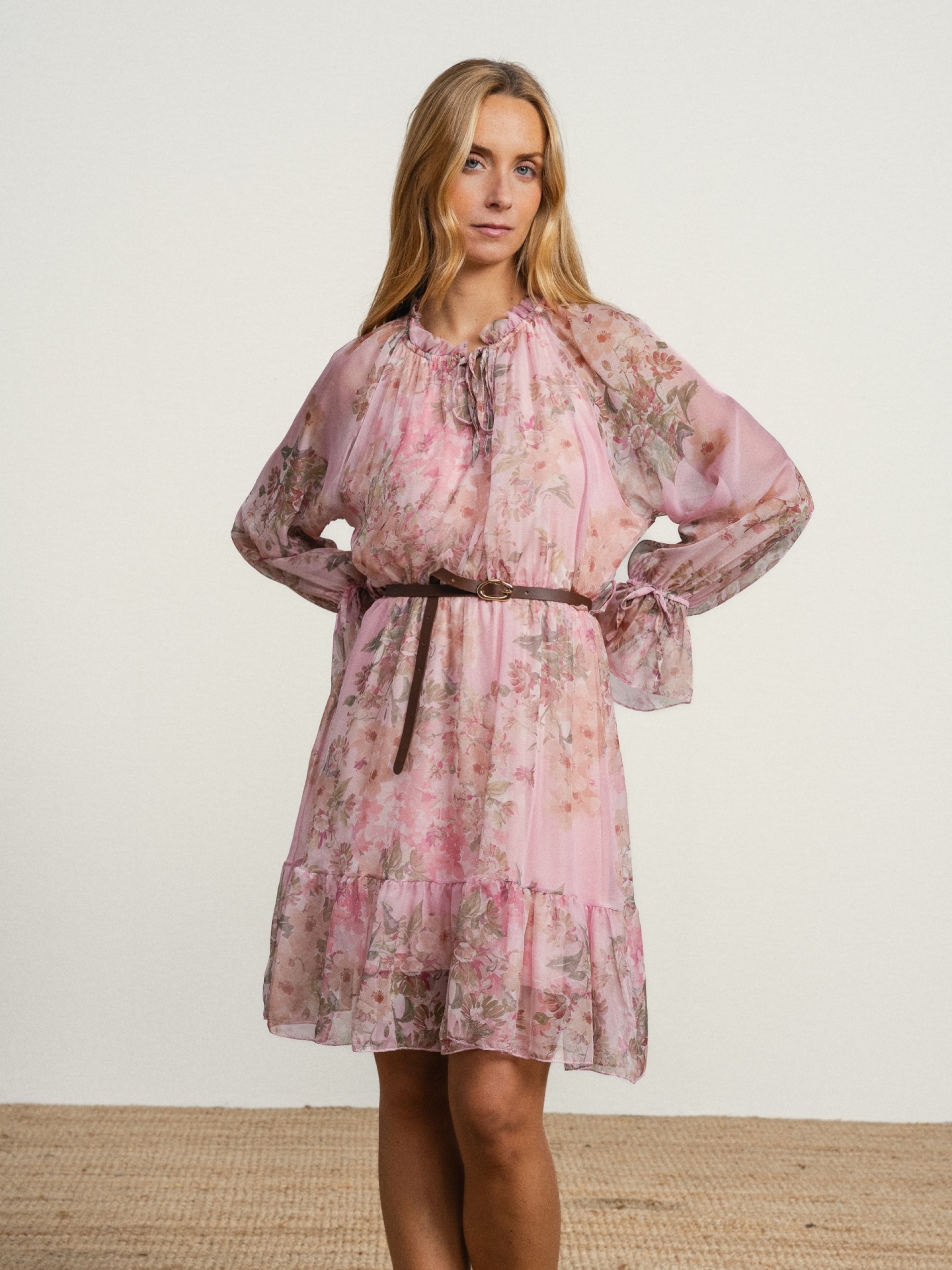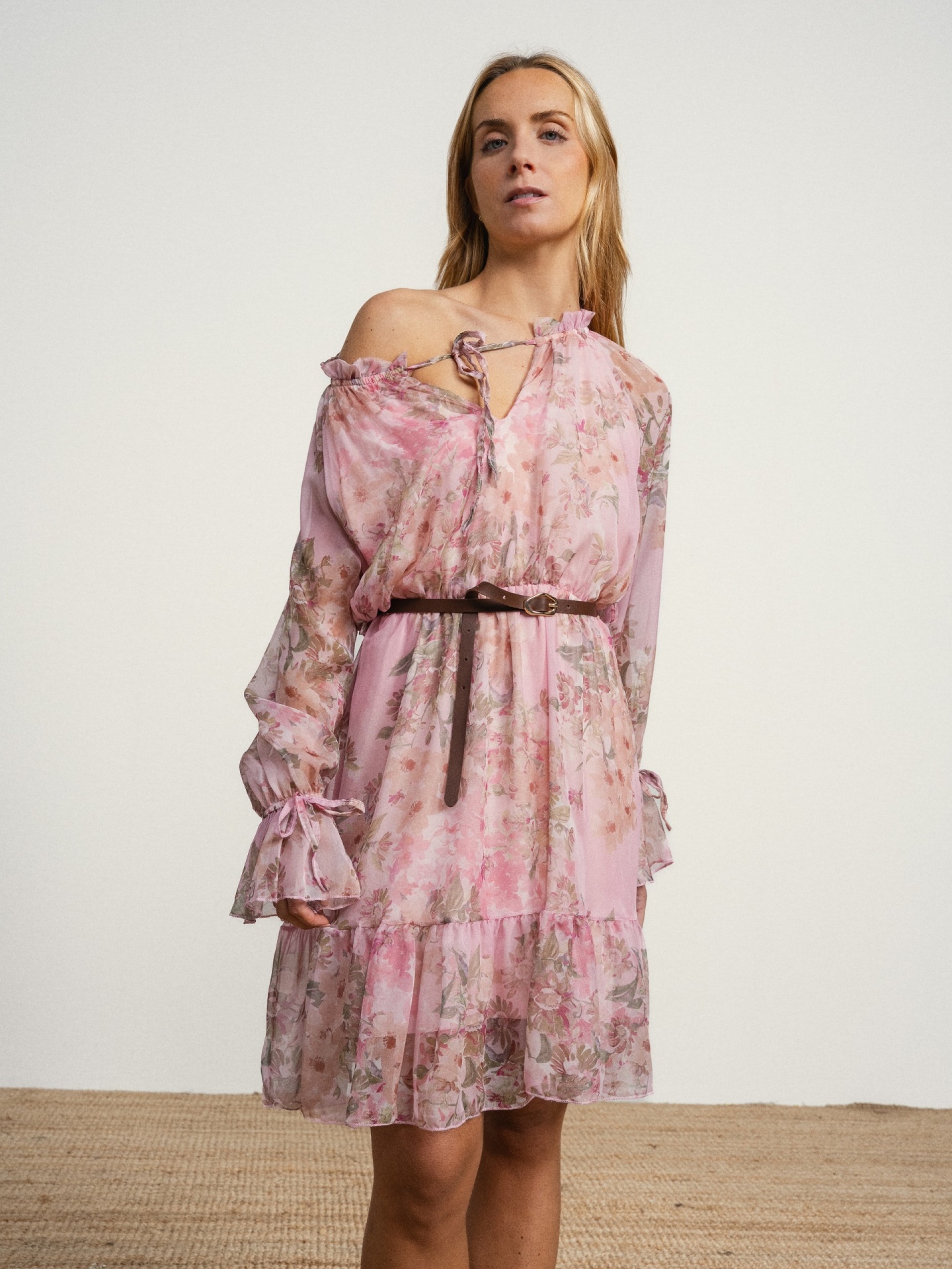 Vestido de corte fluido em tecido leve com estampado em tons suaves. Modelo com decote franzido com cordões para atar e manga comprida com volume. Detalhe de folhos na base que acrescenta movimento.